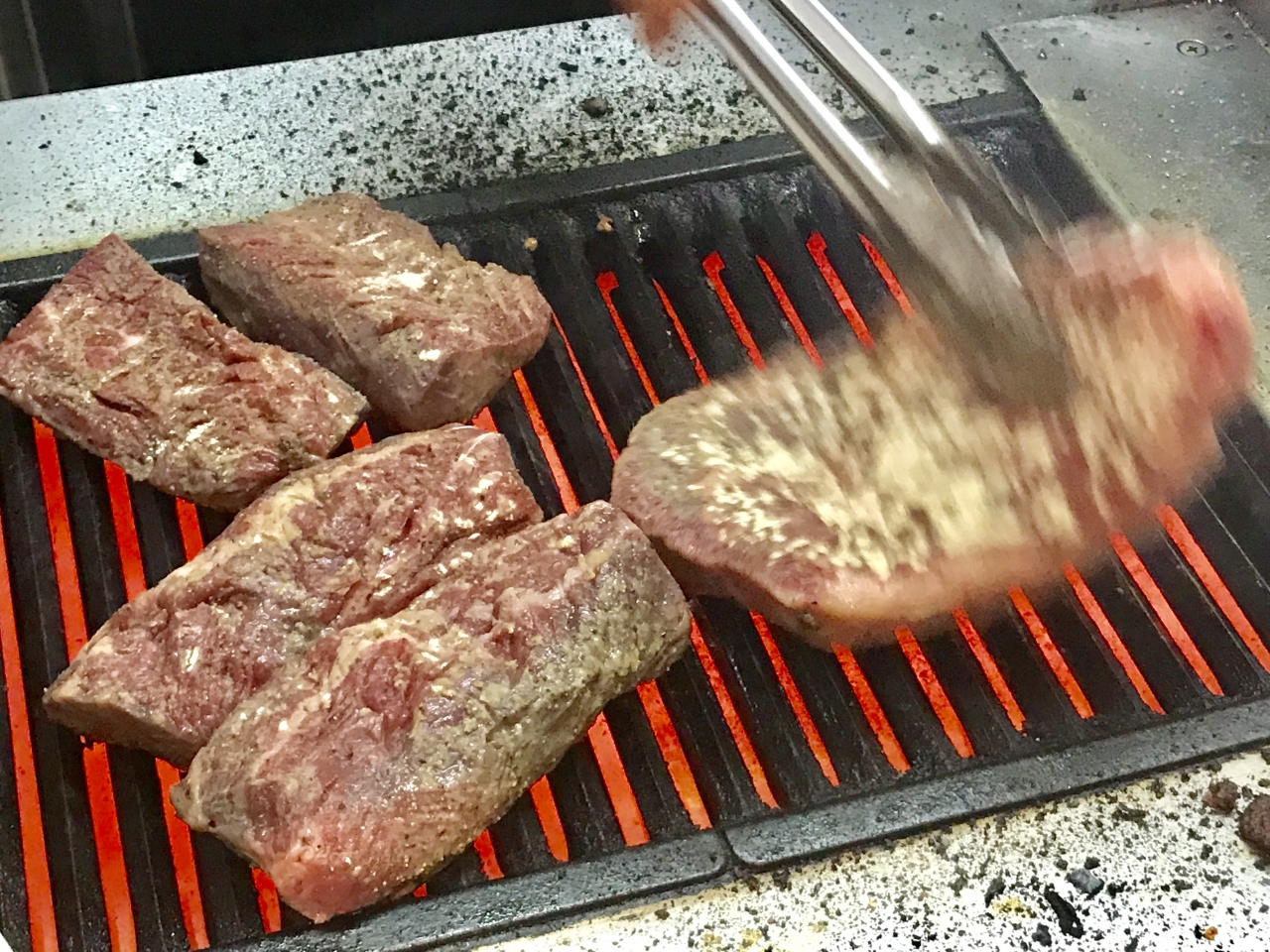 肉の片面に塩胡椒をたっぷりと振りかけ焼き場に・・・同時に鉄板皿を温める。