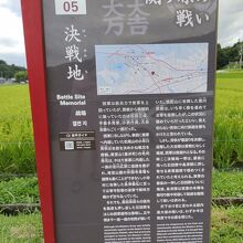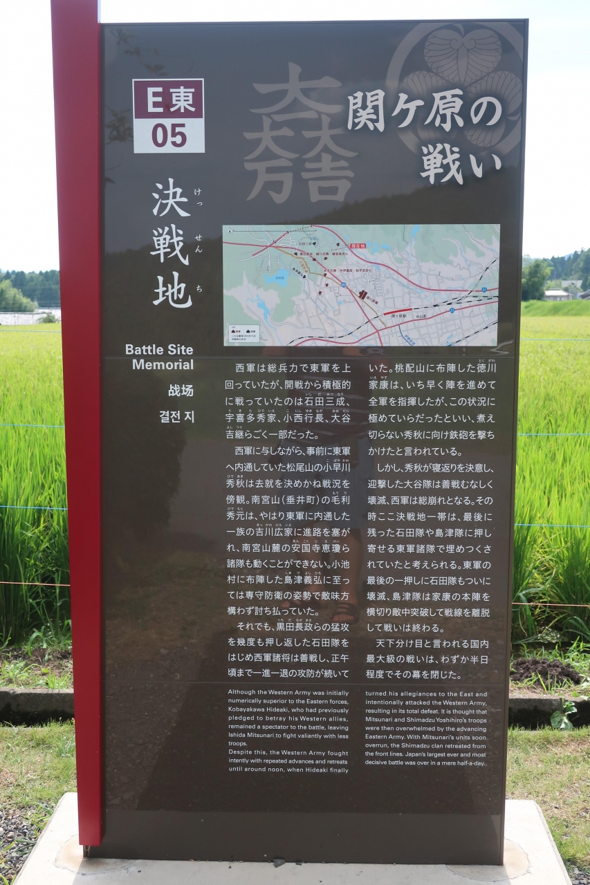 関ケ原合戦 最大の激戦地。 笹尾山を背に、現在は田園の広がる中程に「決戦地」があります。1600年9月15日午前、関ケ原の戦いは西軍有利の展開で進んでいたといわれています。しかし、小早川秀秋の裏切りによって状況は一変し、一挙に東軍が優勢となり、奮闘むなしく西軍は敗北します。そしてこの決戦地は、東軍諸隊が三成の首級を狙って、最大級の激戦が繰り広げられた場所といわれ、この地で激戦が繰り広げられていたのかと思うと、現在はのどかなこの田園風景も全く見え方が変わってきます。