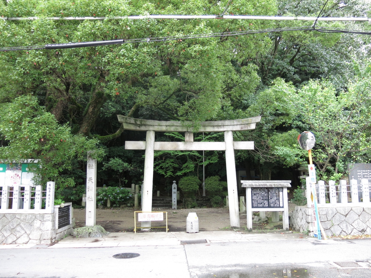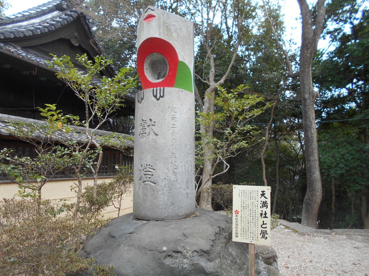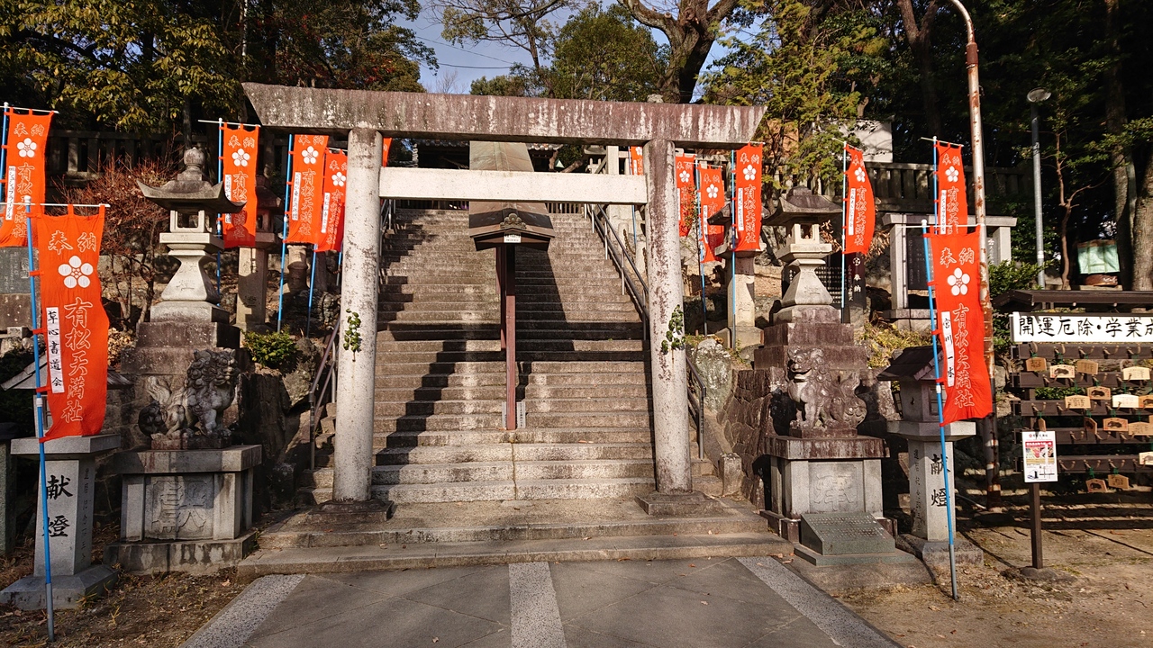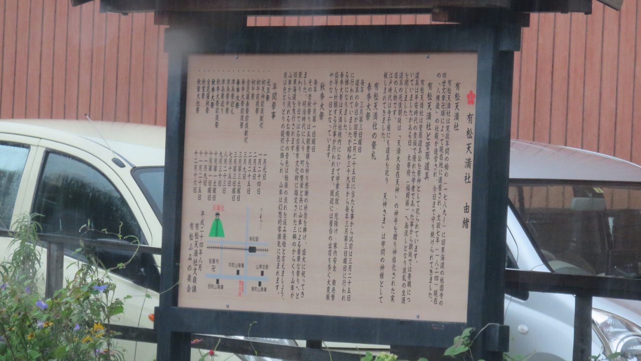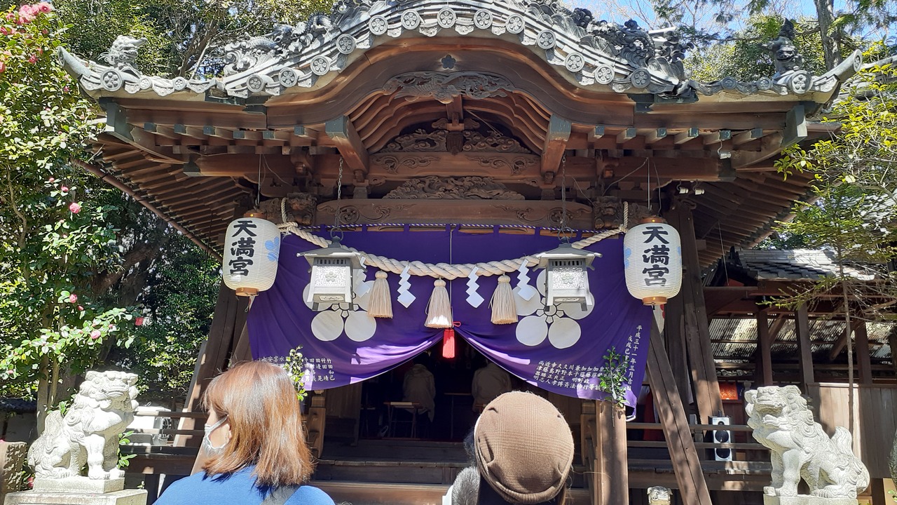 有松駅から線路に沿って西側に10分ほど歩くと石造鳥居があります。木々が生い茂った小山に89段の石段があり上がっていくと板塀... 続きを読むで囲まれた社殿があります。菅原道真を祀っており、麓の古い町並みに建つ祇園寺に神廟がありましたが、18世紀に現在地に奉遷し、1824年に八つ棟造りの社殿が建立されました。境内に6つの末社があり、囲いの前にウソの像が奉納されています。ウソは災いや悪事を嘘にしてくれると言われ、ついてしまった嘘や災いが真や幸運に変える縁起物として祀っているそうです。訪れた日は暑く、長い石段を上がるのがきつかったです。趣ある社殿の瓦屋根から草が生えていたのが印象的です。ぽつぽつ訪れる人がいる静かな境内でした。 閉じる