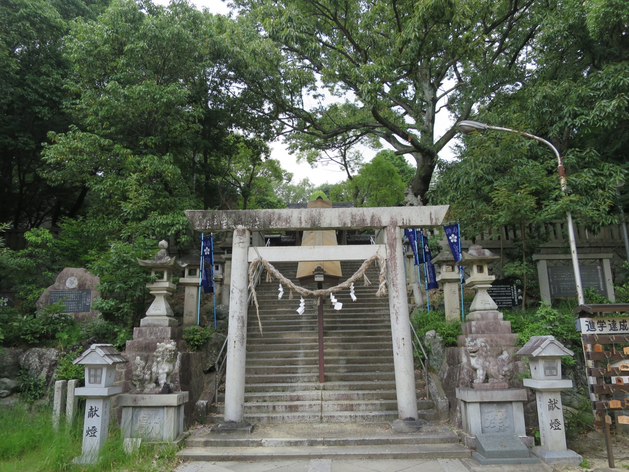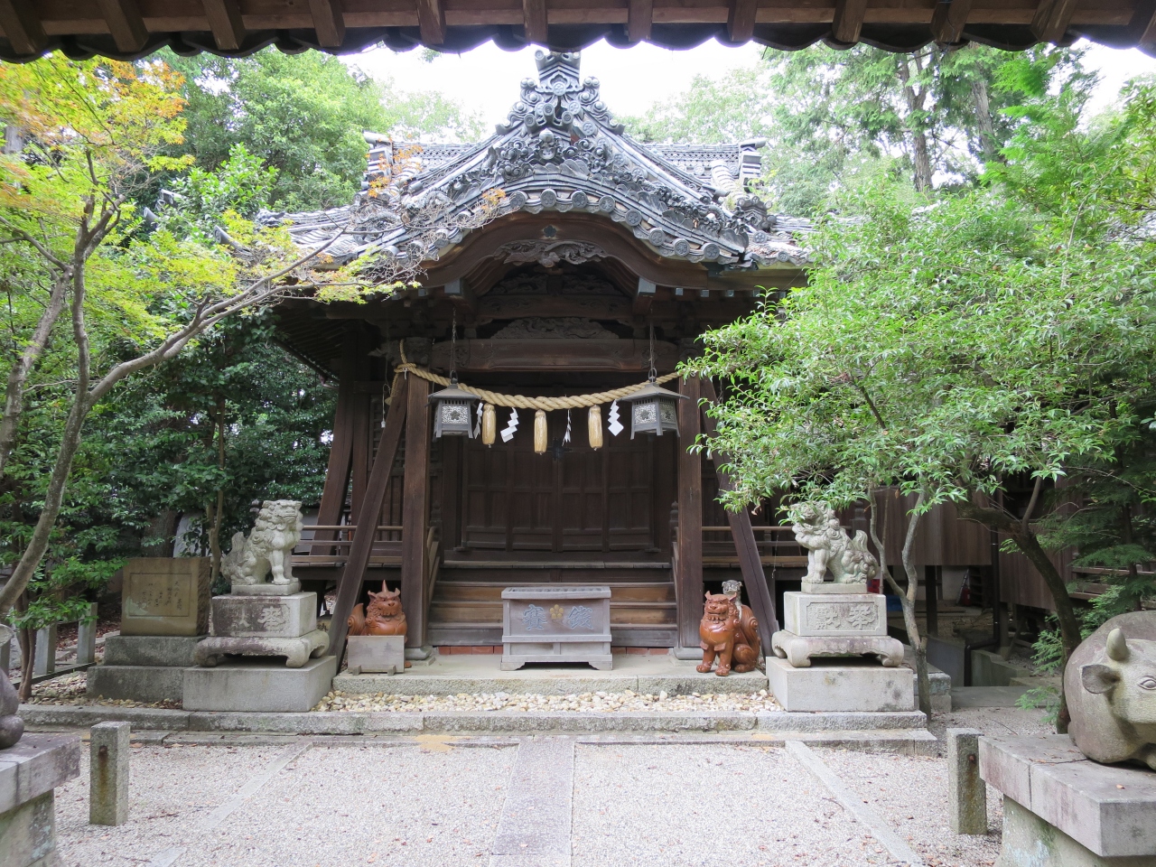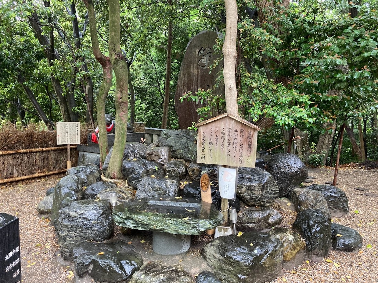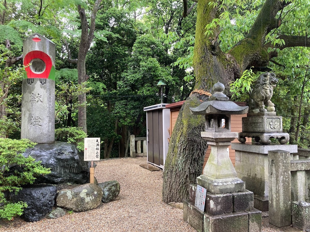有松駅から線路に沿って西側に10分ほど歩くと石造鳥居があります。木々が生い茂った小山に89段の石段があり上がっていくと板塀... 続きを読むで囲まれた社殿があります。菅原道真を祀っており、麓の古い町並みに建つ祇園寺に神廟がありましたが、18世紀に現在地に奉遷し、1824年に八つ棟造りの社殿が建立されました。境内に6つの末社があり、囲いの前にウソの像が奉納されています。ウソは災いや悪事を嘘にしてくれると言われ、ついてしまった嘘や災いが真や幸運に変える縁起物として祀っているそうです。訪れた日は暑く、長い石段を上がるのがきつかったです。趣ある社殿の瓦屋根から草が生えていたのが印象的です。ぽつぽつ訪れる人がいる静かな境内でした。 閉じる