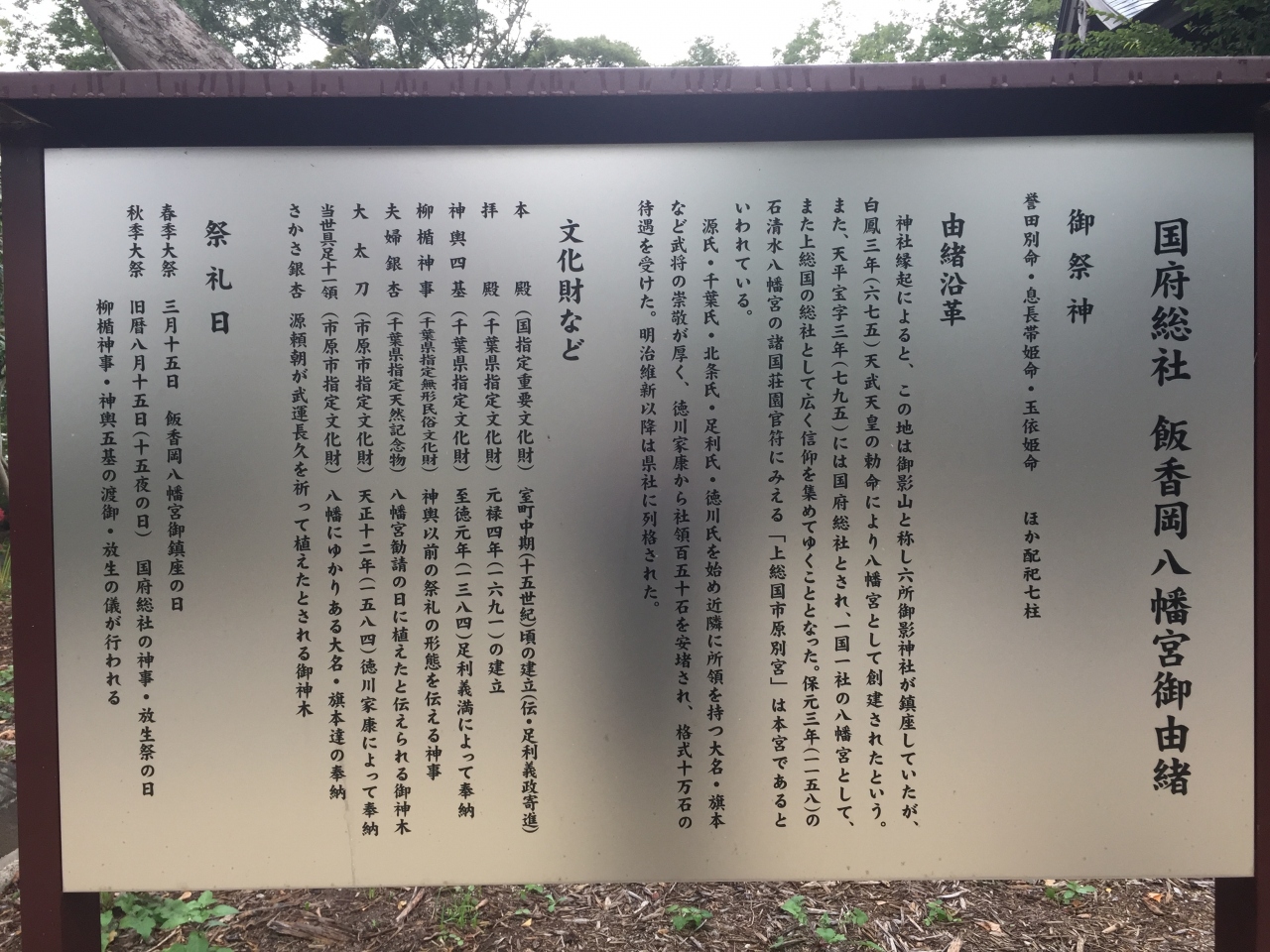 また、天平宝字三年 (759) には国府総社とされ、一国一社の八幡宮として、また上総国の総社として広く信仰を集めてゆくこととなった。