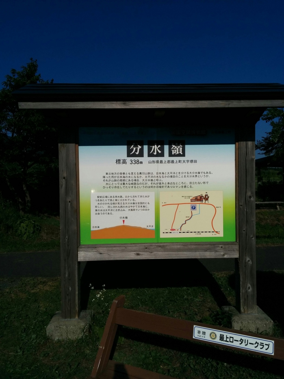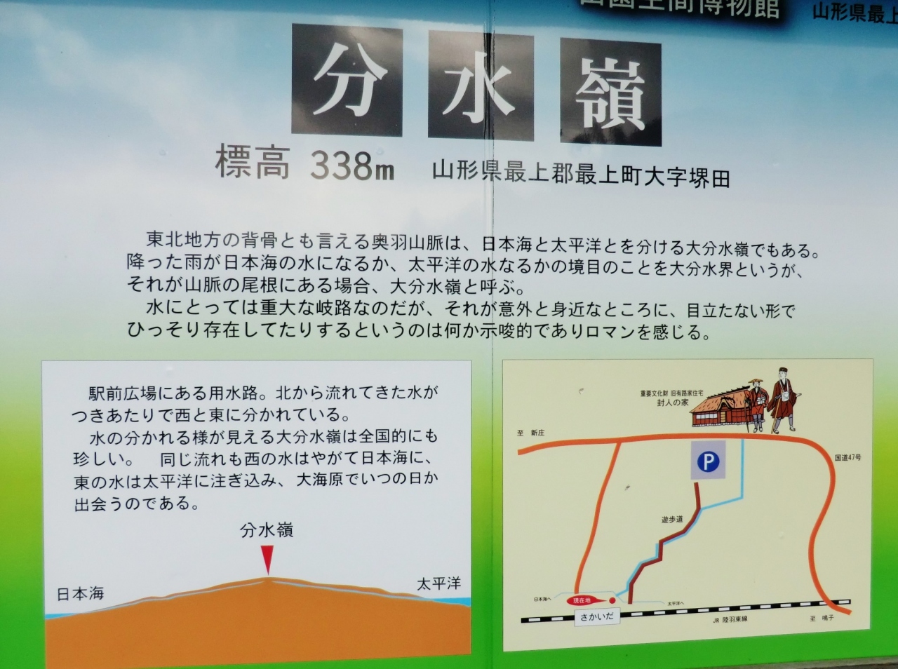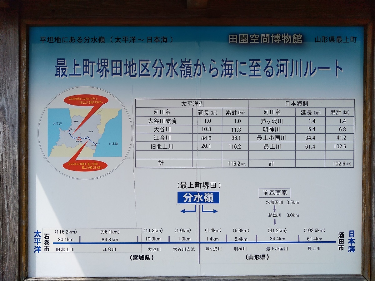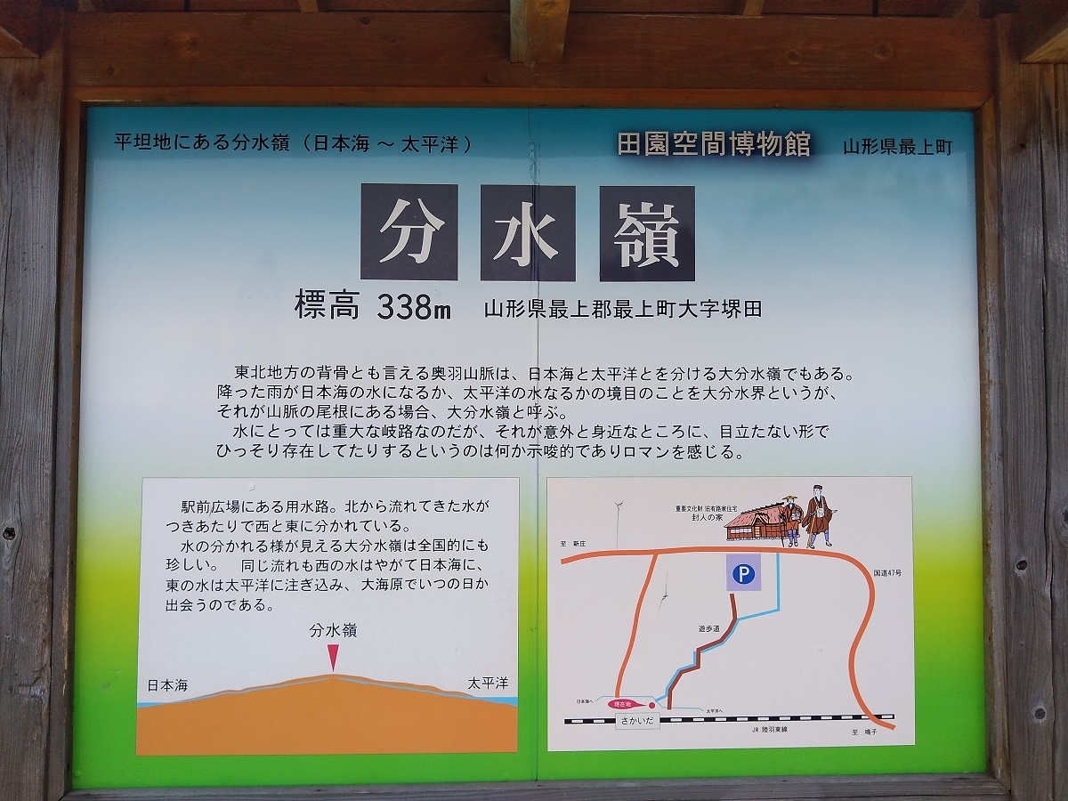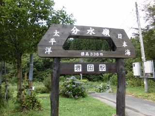分水嶺を見るのは初めての経験である。分水嶺はもっと高山にあるものと思っていたが、このような平地にしかも標高338mの地点にあるとは信じ難い。ここが分水嶺とすれば、ここから水が二手日本海と太平洋に分かれて行くのに、この水が流れ込む川はすべてここより標高が低いこととなる。実際にカメラについているGPSでここ堺田分水嶺測定したら海抜341m、後で訪問した「本合海」(奥の細道で芭蕉が乗船した最上川の船着場)でGPSで測定したら海抜41mであり、大きな落差があることに気が付き信ずる気になった。 閉じる投稿日:2015/09/01