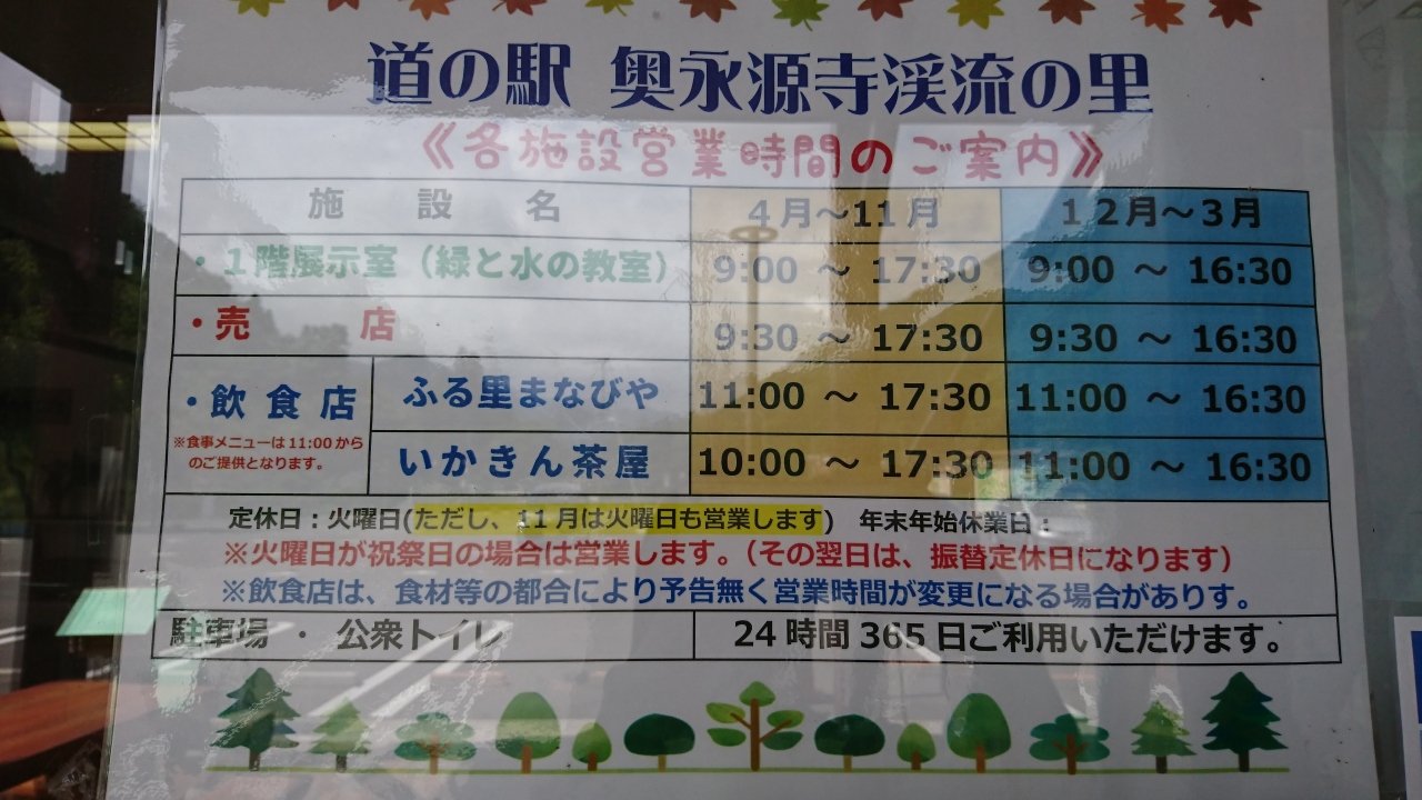 営業時間は9:30~17:30(4月~11月)、休館日は毎週火曜日。キャンプ場の多いこのエリアならではの道の駅、これからも頑張ってほしいです。 閉じる投稿日:2021/07/20