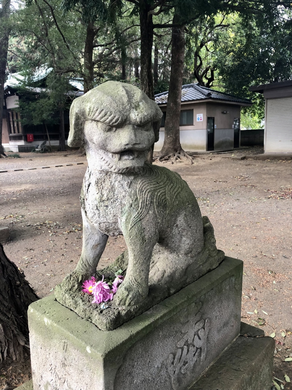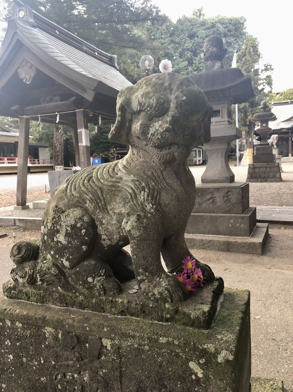 狛犬の足元に置かれている鮮やかなピンクの花が可愛らしく... 続きを読む、ハワイ出雲大社を思い出しました。