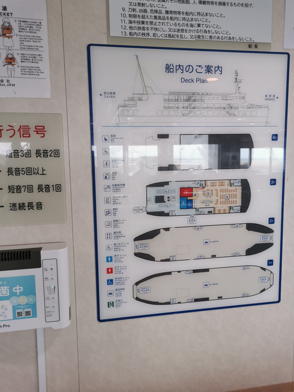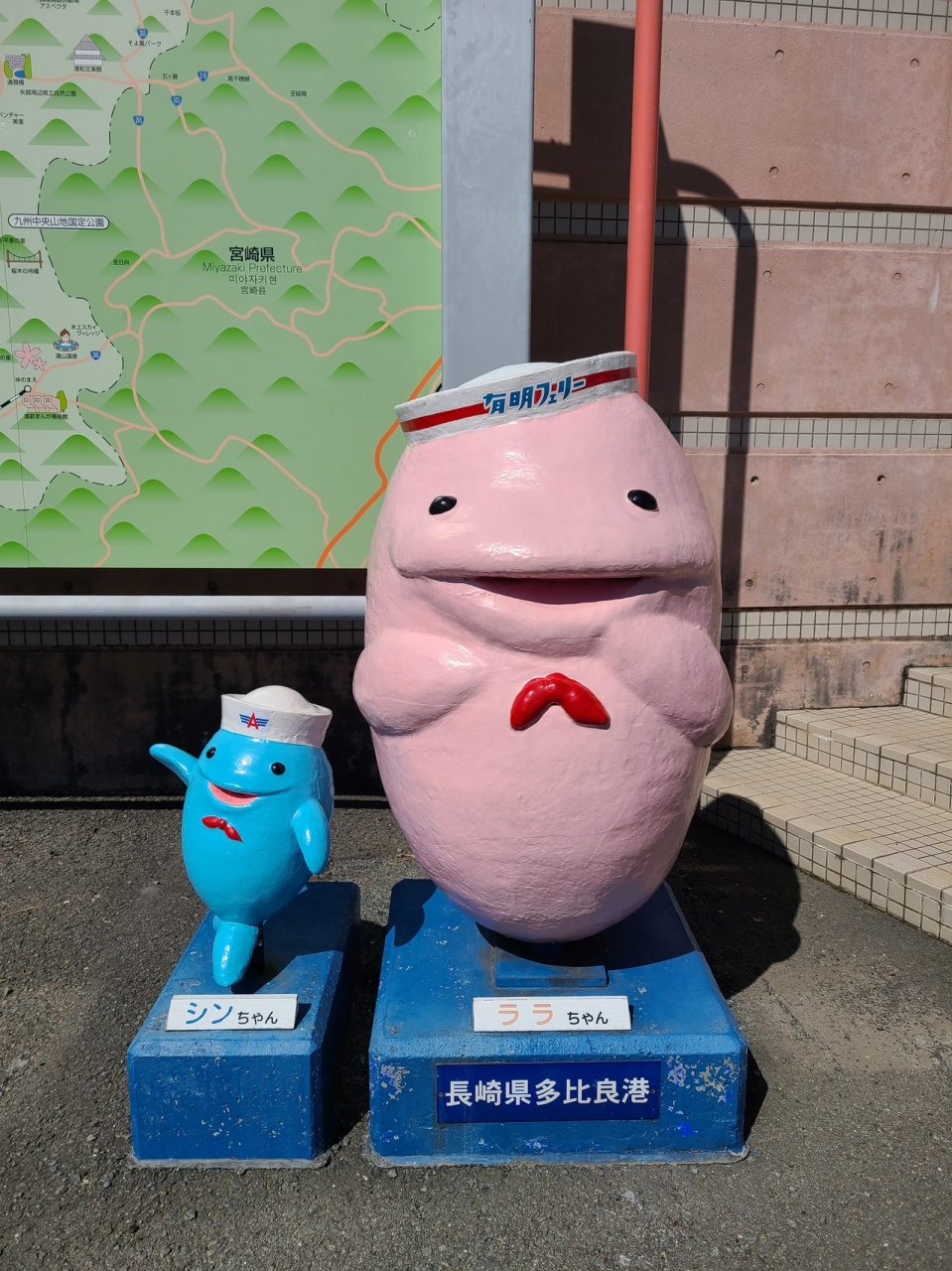 島原雲仙と熊本の長洲を結ぶ有明フェリー、島原雲仙側のターミナルです。 平成6年に竣工したそうですが、建物はきれいにメンテ... 続きを読むナンスされています。 こちらでは休憩しながら買物もできます。売店では島原名産の蒲鉾や竹輪を販売しており、お土産に買っていったりしますが、フェリーの中でちょっと食べたりするととても美味しく感じます。 多比良港から乗船したフェリーは「サンライズ」号。展望デッキはありませんが、船室の前面が展望サロン風になっていて、進行方向の景色を楽しみながらのんびり過ごすことができました。 蒲鉾竹輪は船内売店でも販売。またここで販売しているコーヒーは普通のレギュラーコーヒーですが、くまもんドーナツを+50円で付けられるのちょっとお得感があります。 閉じる