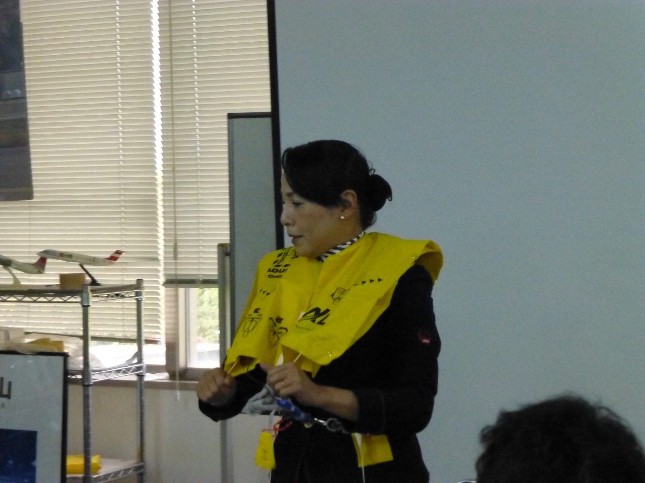 また、CAの方からは、基本的にはほとんど使わない(それでないと困りますが)けれど、いざというときに使い方がわからなくて、というような救命胴衣の使い方の説明と体験訓練(着衣)をさせていただきました。