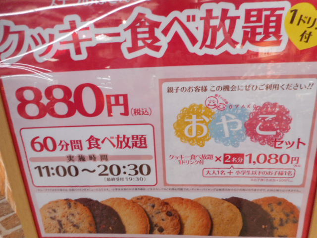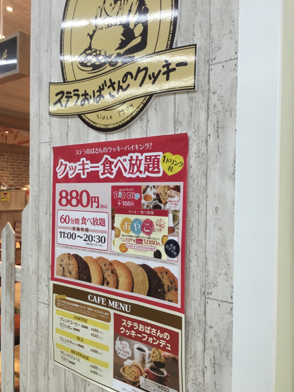 ステラおばさんのクッキー食べ放題にチャレンジしました。1時間で24種類のクッキーが食べ放題で、ドリンクが、コーヒー、紅茶、... 続きを読むオレンジジュースから選べます。ドリンクは期間限定で同じ種類のみ1回までおかわりできます。