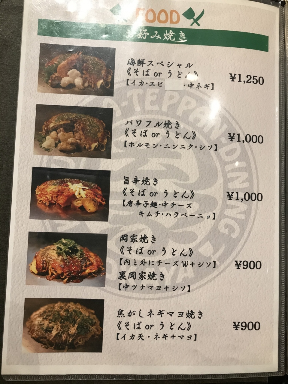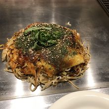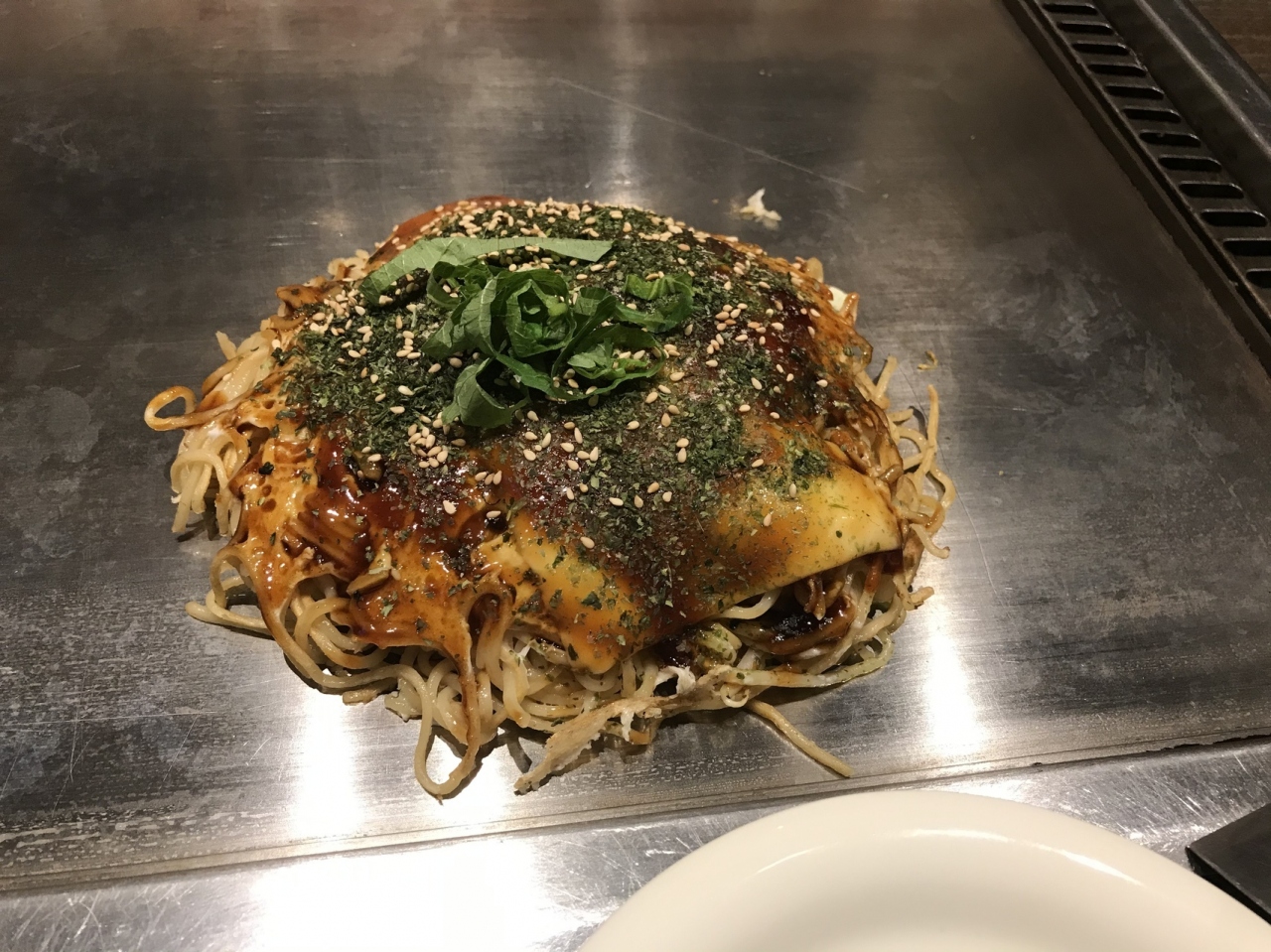 お好み焼きはチーズがW(外にも中にも)でかかり、しそがトッピングされている。お好み焼きにしそを入れるのは広島では普通のようで、中に入れてもトッピングしても美味しい。麺は普通(流行りのパリパリでは無い)だが、ちゃんと炒めてある。