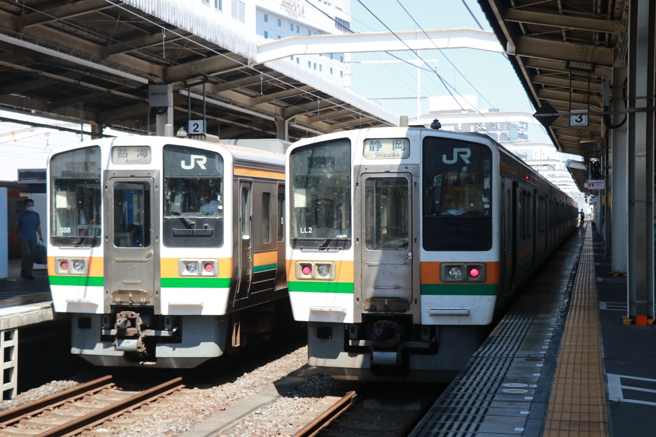 熱海~浜松・豊橋では東京口では既に引退した旧型車両が西に東にと走り回っています。列車によっては2時間半ほど走り続けるような...  続きを読むものもあり、JRになってから導入された車両はトイレがありますが先述した旧型車両にはトイレがなく、どちらの車両も長短距離関係なく運用に入っているので気になる方は注意が必要かもしれません。2-6両と列車によって長さがバラバラですが、各駅の電光掲示板には足元の乗車位置目標が記載されているので不慣れな人でも安心ですね! もともとは長大編成も走っていたのか「なんでそんなにホームが長いの?」と思ってしまう駅も多くありますが・・・
