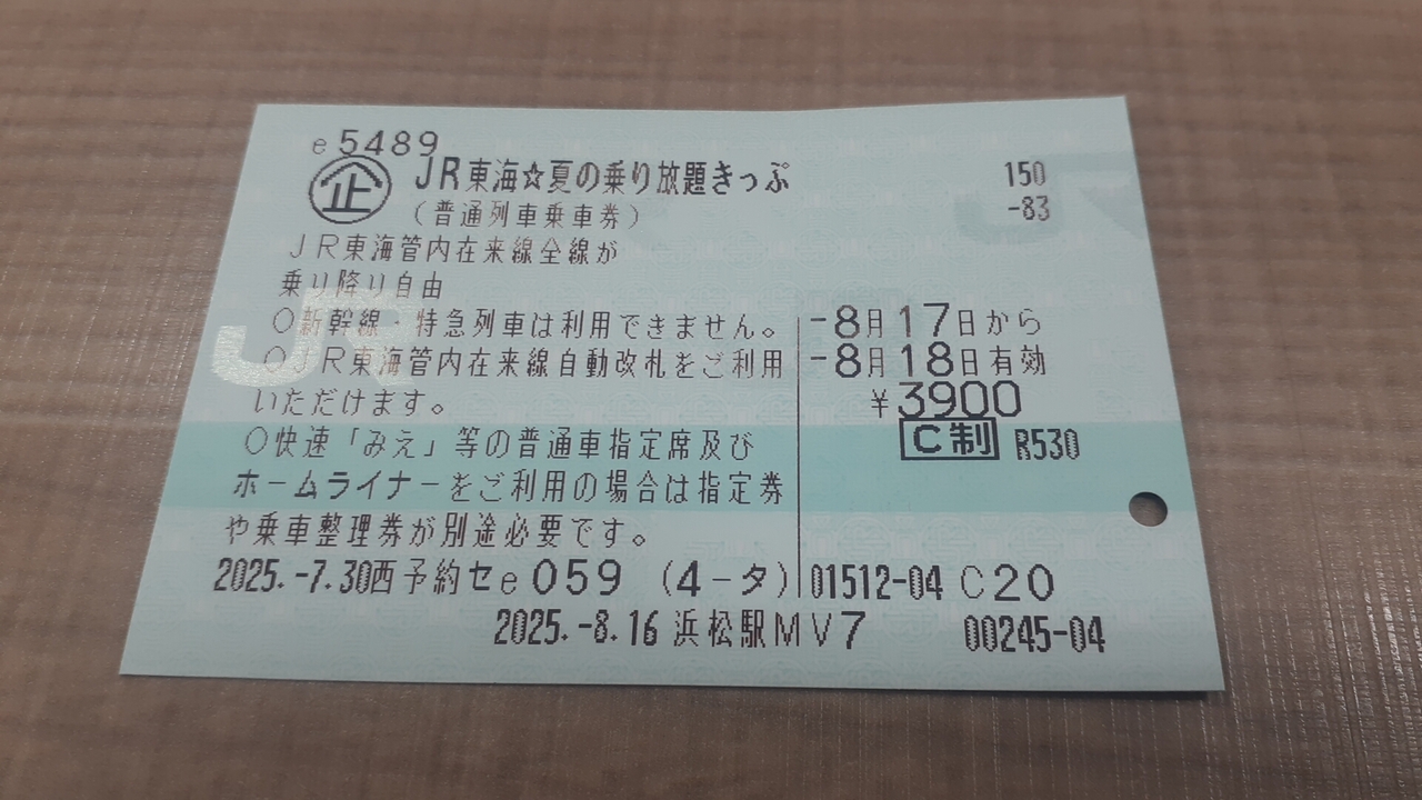 東京と兵庫県の神戸を結ぶJRの鉄道路線です。  そのうち今回は「JR東海 夏の乗り放題きっぷ」という割引切符についてで...  続きを読むす。  この切符、2025年7月19日から2025年9月10分までの間の連続する好みの2日間JR東海が担当する在来線の鉄道路線が3,900円で何回でも利用し放題(乗り放題)となるという切符です。  但し利用し放題となるのは快速列車(特別快速・新快速・区間快速も含む)と普通列車の自由席に限られ、新幹線は勿論、特急しなの・ひだ・ふじかわ等の在来線の特急列車を利用する場合、乗車券部分としても使えず、別途、利用する区間の乗車券・特急券等が必要となりますので、注意が必要です。また快速みえを利用して四日市~津間を移動する場合、伊勢鉄道の運賃が含まれていない為、別途、伊勢鉄道の乗車券が必要なので、こちらも注意が必要です。  ただ快速みえ等快速列車・普通列車の普通車指定席とホームライナーを利用する際はJR東海区間の乗車券部分は有効(繰り返しにはなりますが、伊勢鉄道等他の鉄道会社区間を利用する場合、その乗車券は別途必要です。)となり、別途、指定席券・乗車整理券のみ購入すれば利用可能です。  とはいえ誰でも利用できるわけではなく、エクスプレス予約又はスマートEXを利用して熱海~米原間のいずれかの駅までの東海道新幹線の特急券を購入している又はICサービスの申込をしていないと購入出来ない為、不便です。  2025年8月17日の日曜日に東海道本線の浜松~米原間と2025年8月18日の月曜日に東海道本線の熱海~浜松間をそれぞれ利用しました。  ちなみに浜松~米原間のうち豊橋~米原間は特別快速、熱海~浜松間のうち沼津~浜松間はホームライナーを利用した為、比較的快適な移動をすることが出来ました。また浜松~米原間の所定運賃は3,410円、熱海~浜松間の所定運賃は2,640円する為、合計6,050円し、都合2,150円得するかたちになりました。  しかし快速列車・普通列車しか乗れない点をどう判断するかによりこの切符の利用価値は大きく異なり、行き先によっては特急列車を利用しないと不便になる場合もあり、少なくとも土日もしくは日月で利用するのであれば8,620円かかりますが「JR東海&16私鉄乗り鉄たびきっぷ」を利用したほうが特急列車の乗車券として使える点で利用価値が高いかもしれません。  閉じる