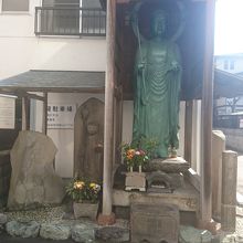 当初、専念寺の境内に建立されたが本堂などが戦災で焼失したため、今はここ専念精舎手前の通り脇の小ぢんまりした囲いの中に、一体だけ寂し気に立っています。