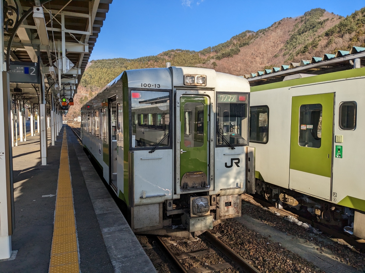 進行方向左に古い改札台のある小佐野駅、右にY字柱が特徴的な土沢の木造駅舎が見え、鉄道ファンとしては非常に旅情を誘われる。
