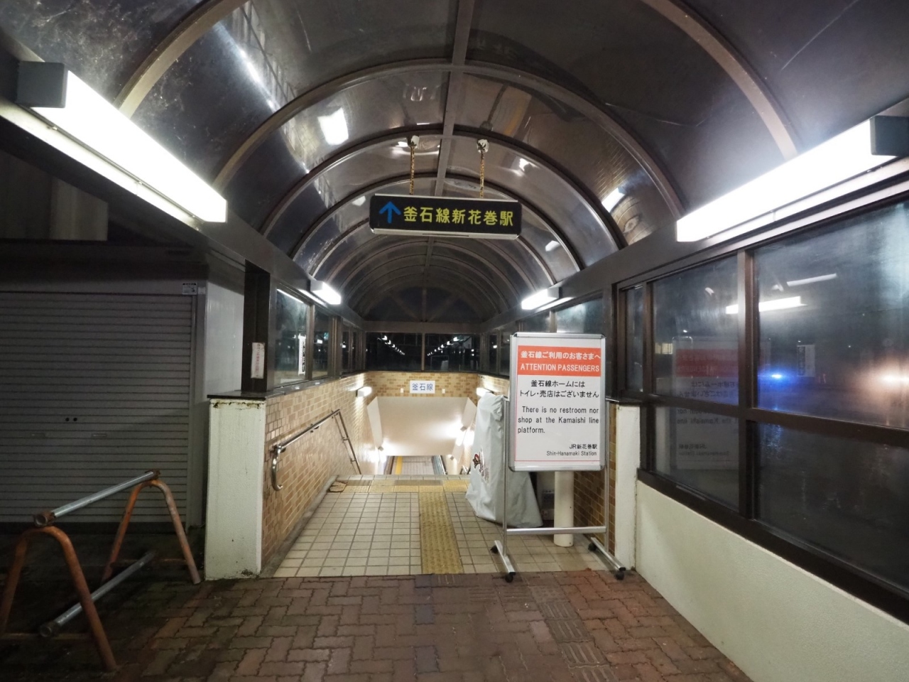 釜石線の新花巻駅ですが、新幹線が停車する駅でありながら無人駅となっていました。具体的には釜石線の新花巻駅は基本的にホームのみで駅舎もありません。また新幹線の新花巻駅の駅舎とは直接繋がってなく、新幹線を利用する場合、地上の通路を通って新幹線の新花巻駅の駅舎の中に入るかたちになります。