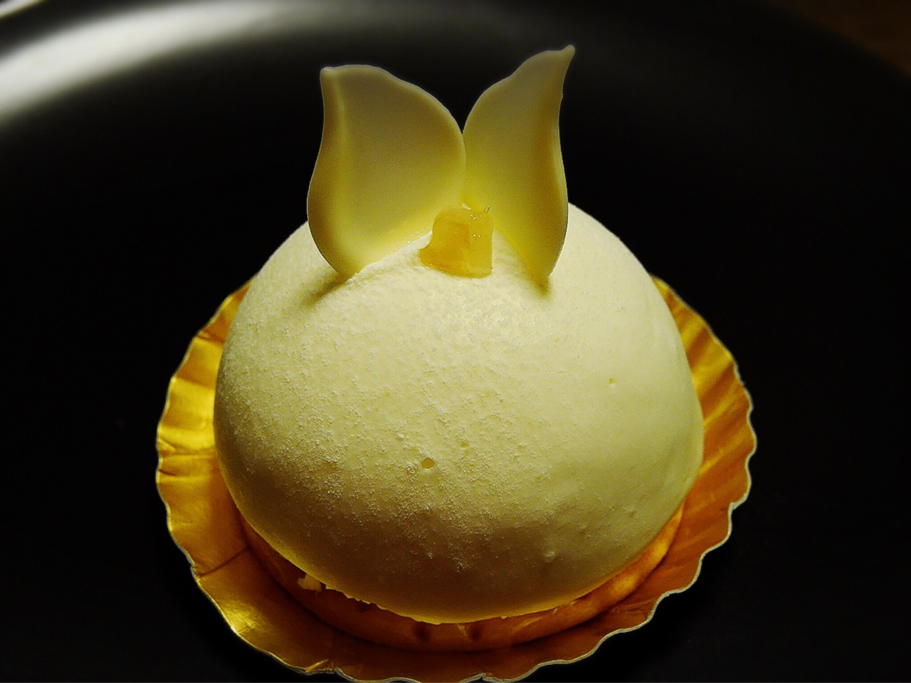 レアチーズは、ドーム型で、トップには天使の羽よろしくホワイトチョコのトッピング。