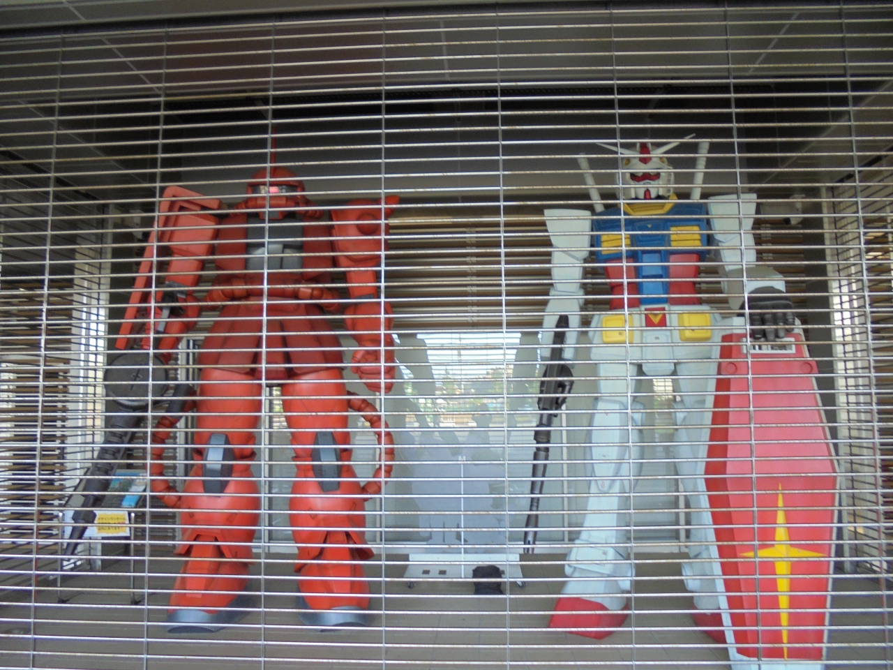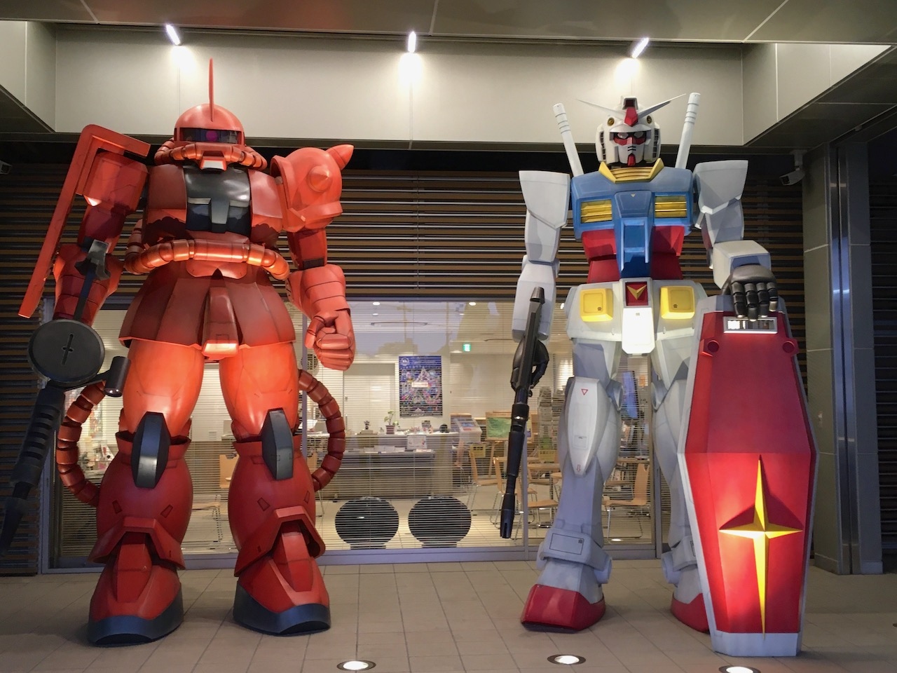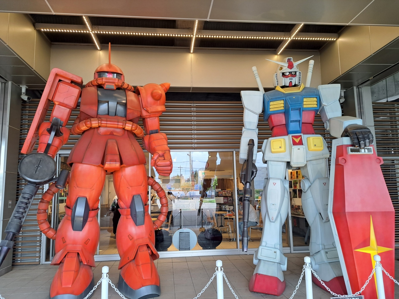 そしてこちらの目玉は高さ3.6mの「ガンダム&シャア専用ザク」のモニュメント。稲城市出身のメカニックデザイナー大河原邦男氏に関連するプロジェクトを同市が進めていることもあり、その一環として2体の像が格納庫のようなスペースに収まっています。