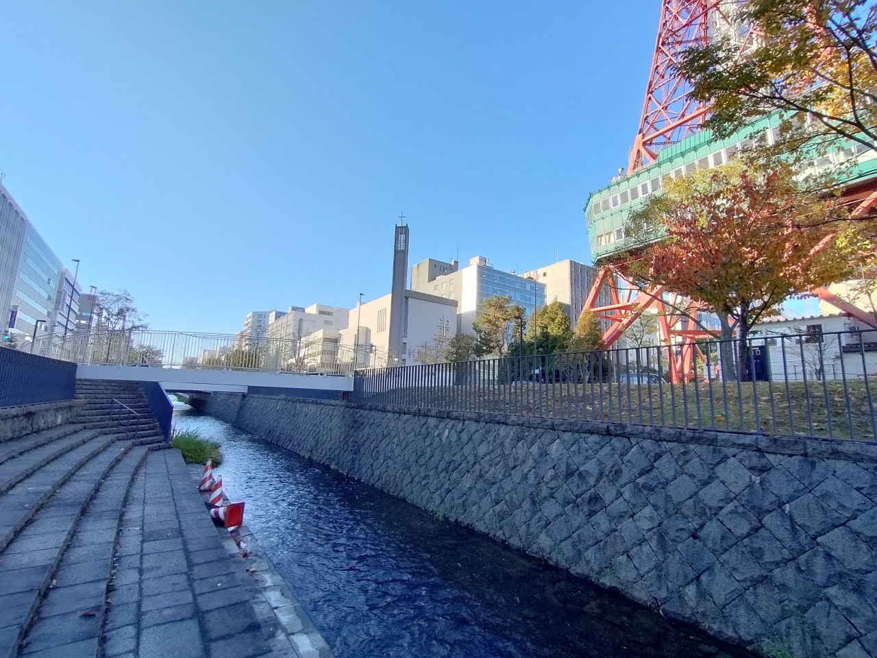 観光客にも目につくところでは、さっぽろテレビ塔の裏側(東側)や、場合によっては中島公園の中や縁を流れる様子、あるいはテレビ塔とは7、8km離れた北の方の創成川通り沿いのポプラ並木の生える創成川などがあるかもしれません。