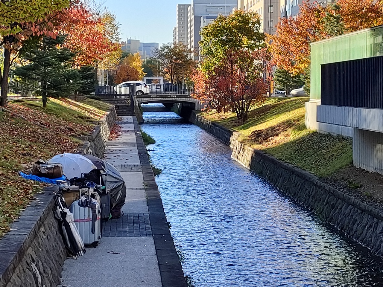 そんな大都市を流れる川ですが、2022年は何と鮭が遡上したと北海道内のニュースでちょっとした話題になりました。ニュースが流れた直後の10月25日辺りに、テレビ塔裏辺りが川面に降りられる創成川公園になっているため、訪れてみましたが、なかなか鮭は見つかりませんでした。ニュースでも言うように、中島公園の先で豊平川につながっている(取水している)ため、迷い込んでしまったものがちょっといたのでしょうか?