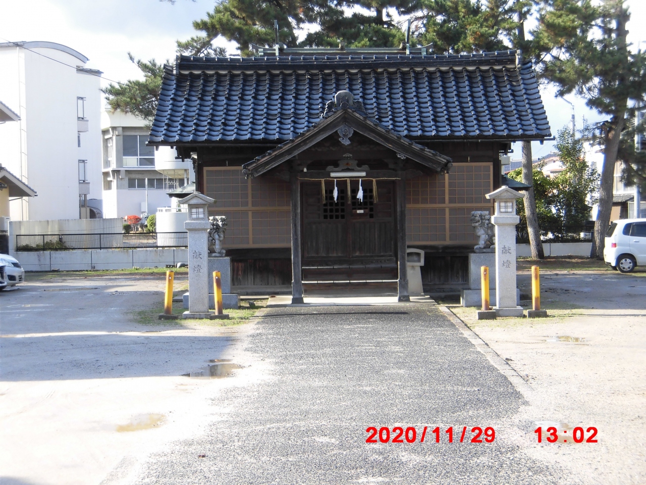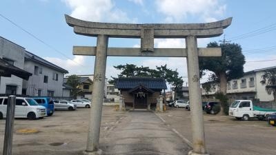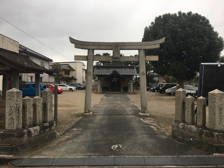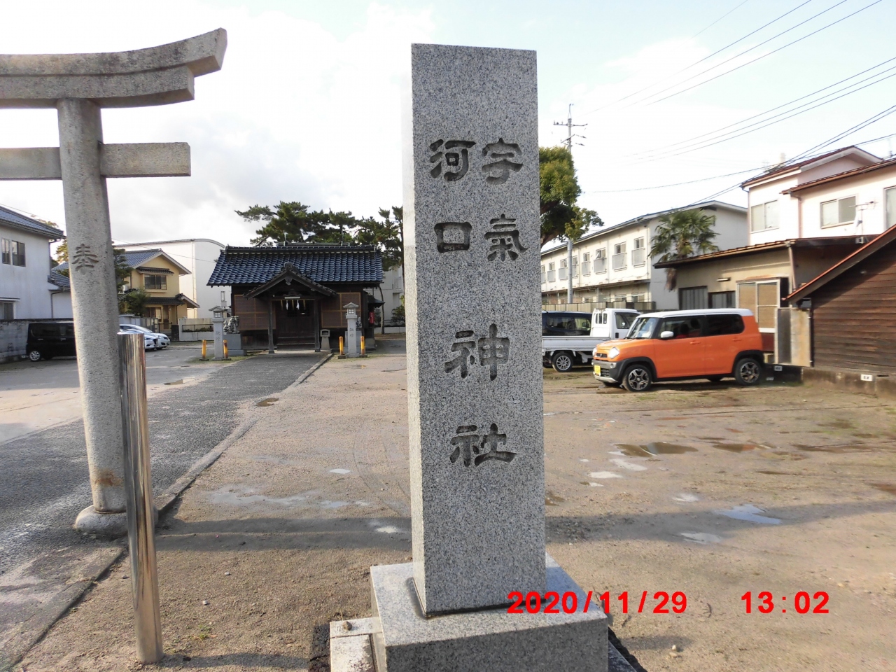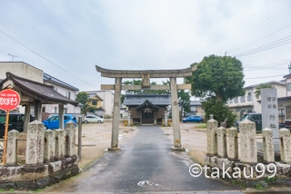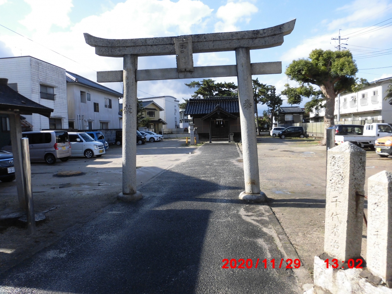 中海に注ぐ旧加茂川の河口近くにある駐車場が目立った神社