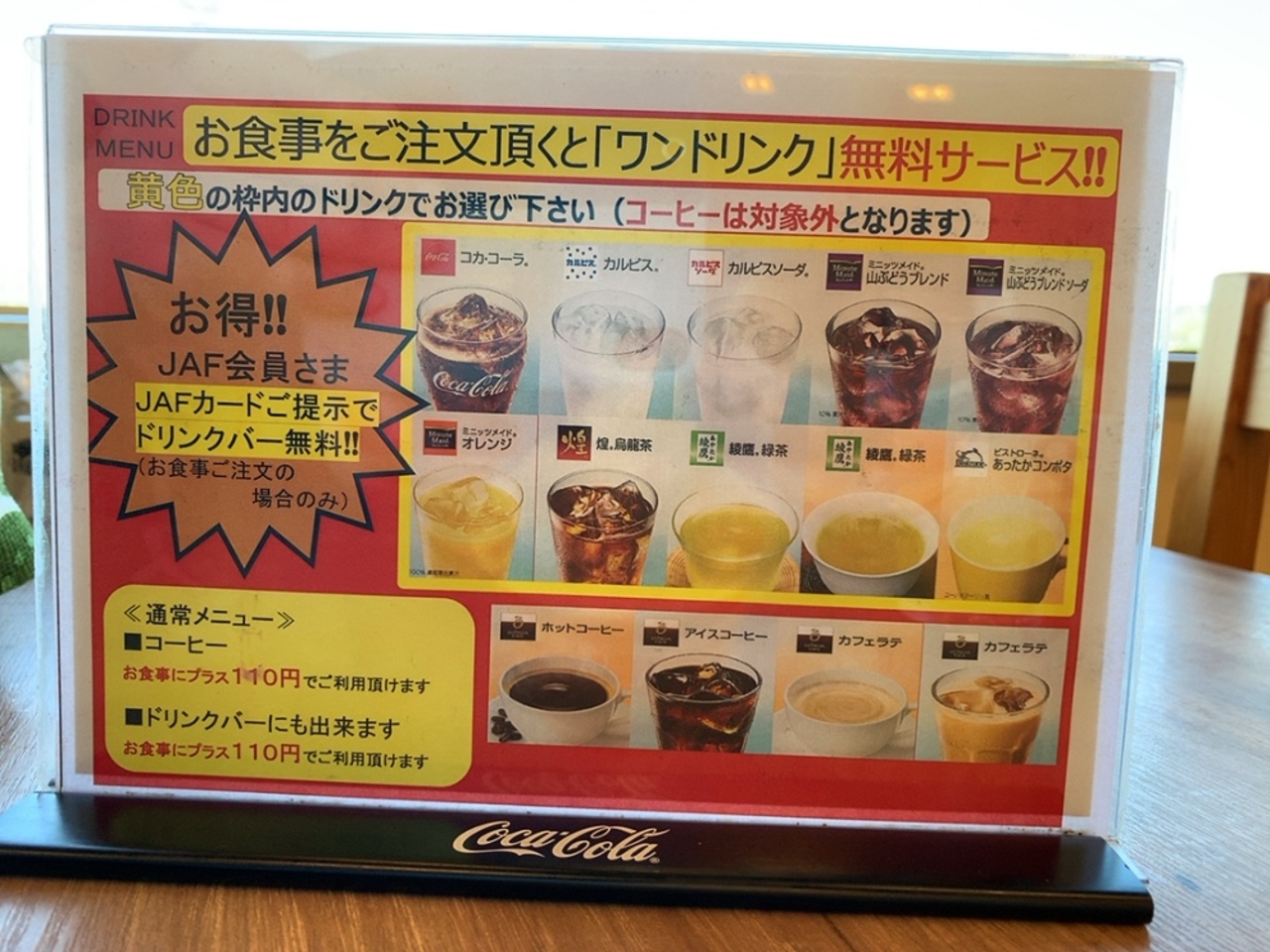 ランチタイムの混み合う時間をかなり過ぎてたからか、店内はガラガラ。 店員さんの対応もとっても丁寧でした。 もともとワンドリンク付きのメニューでしたが、JAFカードを持ってる場合は、ドリンクバーに変更が出来ました。