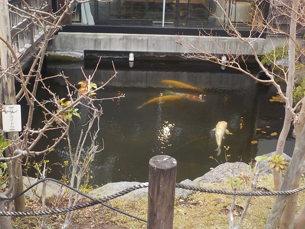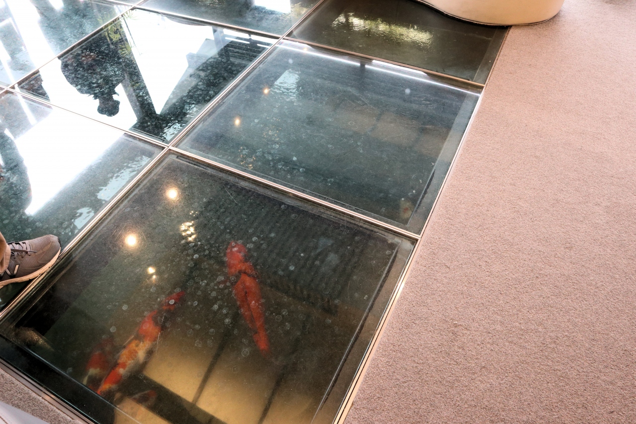 また、庭の池がそのまま館内の下まで引き込まれたガラス張りに成って、大きな錦鯉がいくつも悠々と泳いでいるのは圧巻ですよ?~。
