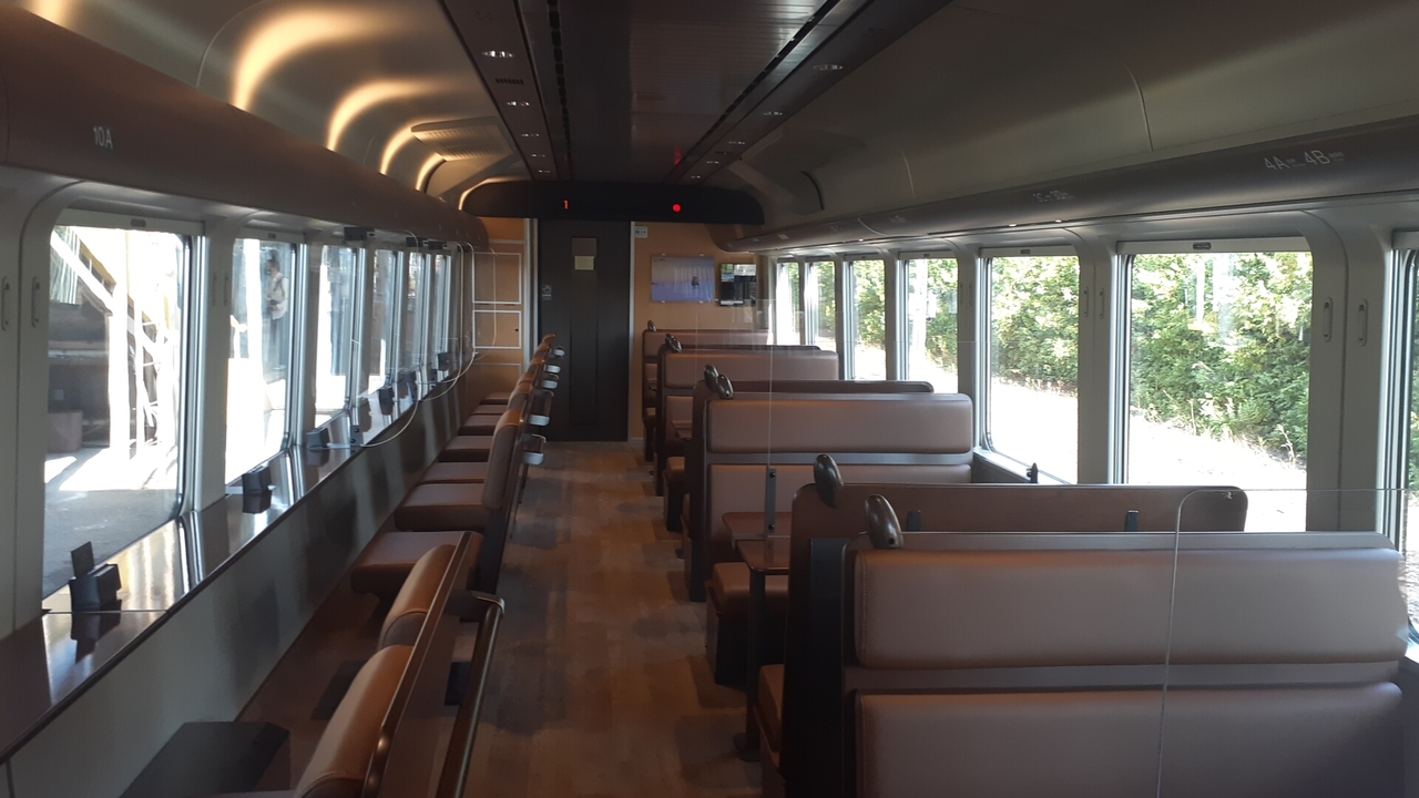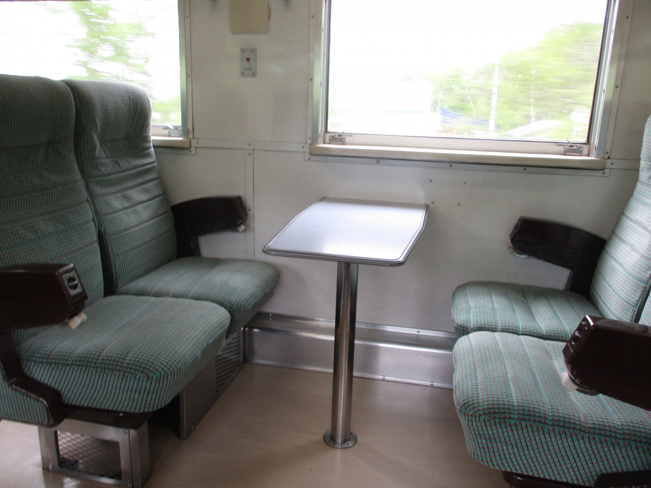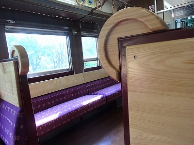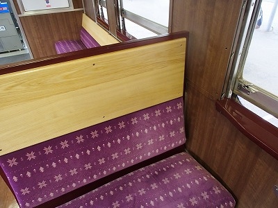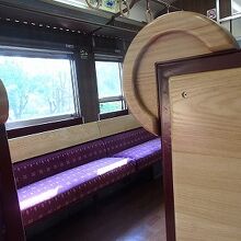 一方、1号車のラベンダーラウンジですが、片方は4人掛けのボックス式シート、もう片側は窓側に向いて座るソファー風シートとなっていました。