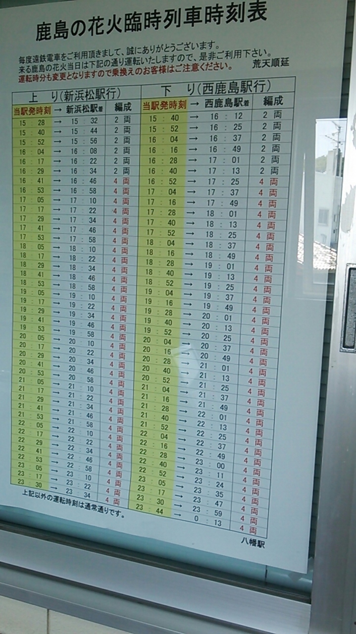 2019年8月3日は終点の西鹿島駅から... 続きを読む徒歩10分程度のところで「鹿島の花火」と称する浜松近辺では有名な花火大会が開催される為、16時頃より時刻の変更があり、特に20時以降は20分おきから約12分おきに本数が増えるそうです。また通常2両での運転ですが、4両での運転に車両の数が増える為、その点も助かるかと思います。
