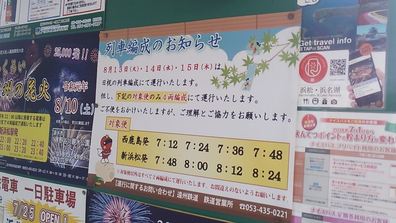 また2019年8月13日から2019年8月15日までの3日間は日祝日ダイヤとなり、基本的には本数の減便はありませんが、朝夕に運行されている4両での運転はなく、新浜松8時前後に発車する4本の列車を除き全て2両での運転となるらしく不便さは否めません。