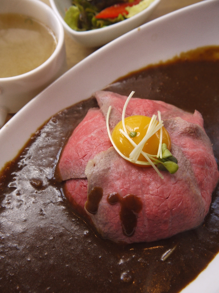 皿にライスを半球状に盛り、薄く切り分けたローストビーフ5枚で覆い、生卵の黄身をトッピング。その周りにカレーを掛けている。