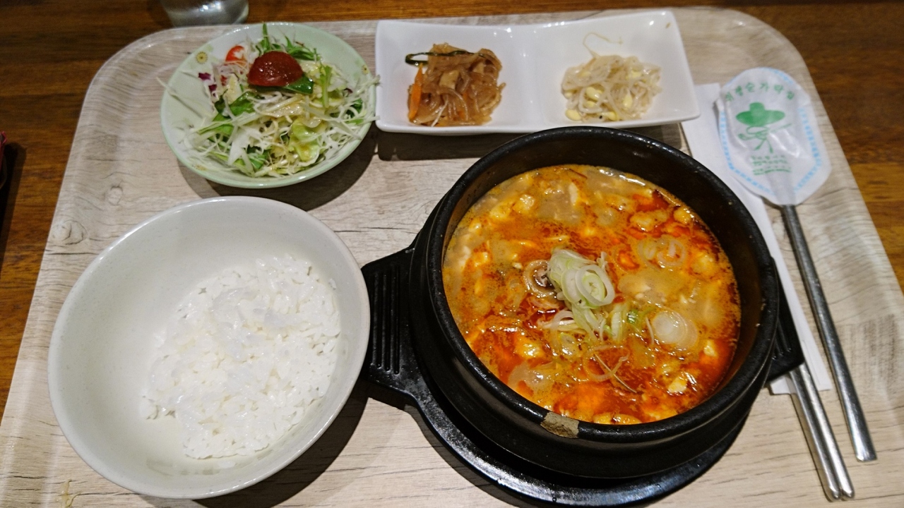 鍋の他に、サラダ、チャプチェ、もやしのナムル、ごはん付き。