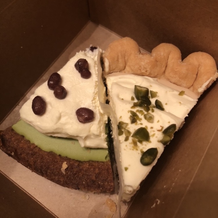 対して抹茶大納言のほうは甘さは多少控えめ。抹茶ムースは2層になっていて底のほうが濃い味になっています。パイ生地はクッキーのようにザクザクで、しかも塩っけがあり甘さとのバランスが取れていて、個人的にはこちらのほうが断然好みでした。