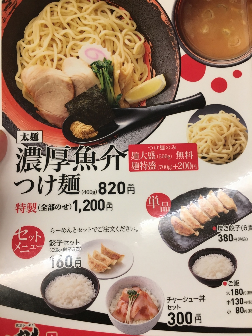 メニューは濃厚魚介豚骨のつけ麺とラーメンの2種。つけ麺の大盛り(無料)を注文しました。