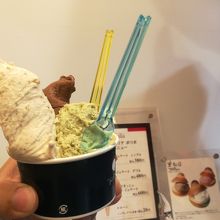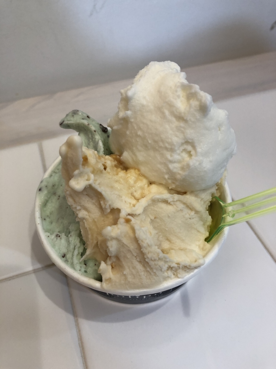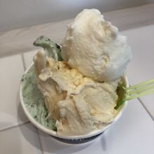 カップのトリプルフレーバーにしてキャラメル、メンタ、ヤギミルクを夫と分け合い店内で食べました。さっぱりと食べられて美味しかったです。