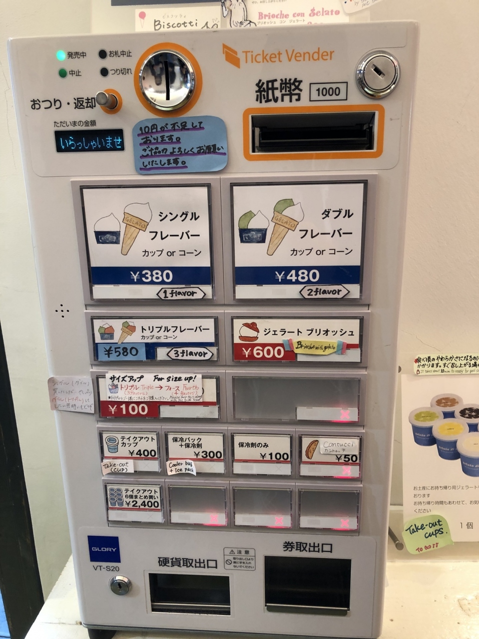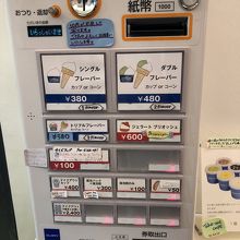 まず入口の自販機でチケットを購入します。シングルフレーバーが380円で、フレーバーを一つ追加するごとに100円増しになります。カップもコーンも同じ価格です。