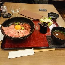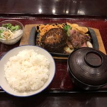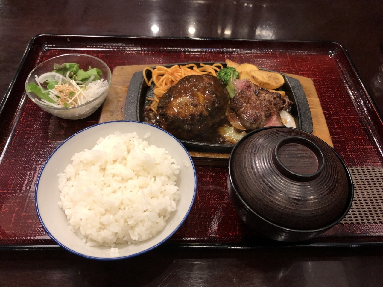 ハンバーグにはサラダとごはん、お味噌汁もついてきます。ハンバーグはつくりが丈夫で、はしで簡単に切れません。中はレア状態なので、ストーンで加熱するもより、そのまま食べるもよし。最初に味付けがしてあるので、そのまま食べるのがおすすめだそうです。食べ応え抜群でした。