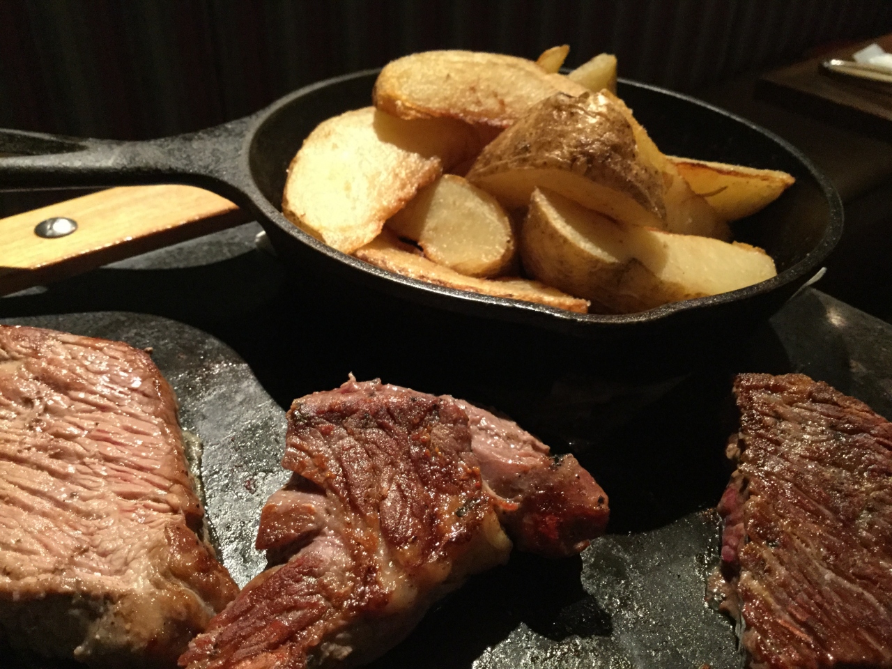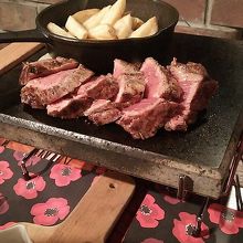 お肉は熱く焼いた鉄板の上にのせられて出てきて、自分でひっくりかえして表面を焼きます。