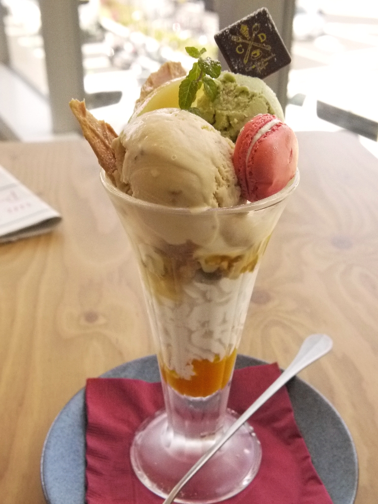 背の高い容器にピスタチオアイス、バニラアイス、塩キャラメルアイス、生クリーム、マカロン、ワッフル、ナッツ、ドライフルーツ、オレンジソース、チョコレートを盛っている。豪華なパフェ。