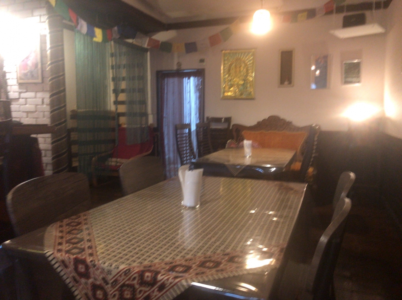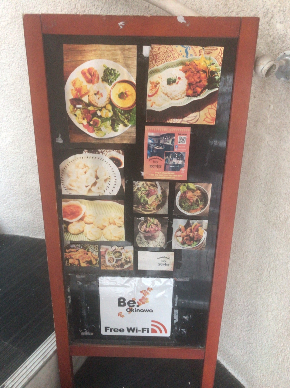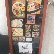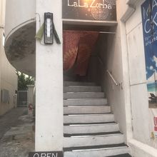 2階の入り口へは階段のみ、階段の途中にメニューが記載された看板が置いてあります。入り口はエスニックなデコレーションで飾られています。