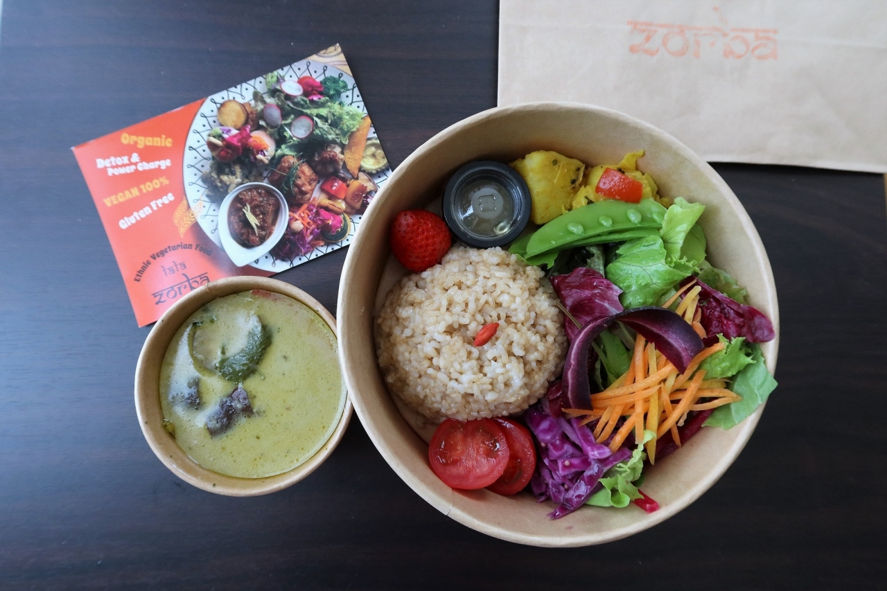 この日は、タイ風ココナッツカレーをテイクアウト。カレーとごはん(玄米かターメリックライス)に、サラダなど野菜のお惣菜付き。