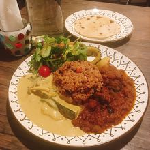 今回は豆と野菜のインドカレー・かぼちゃのタイ風ココナッツカレーのハーフ&ハーフカレーを注文。オーガニックサラダ・サブジ・アチャールチャパティ・ターメリックライス付き 1,980円(税込)