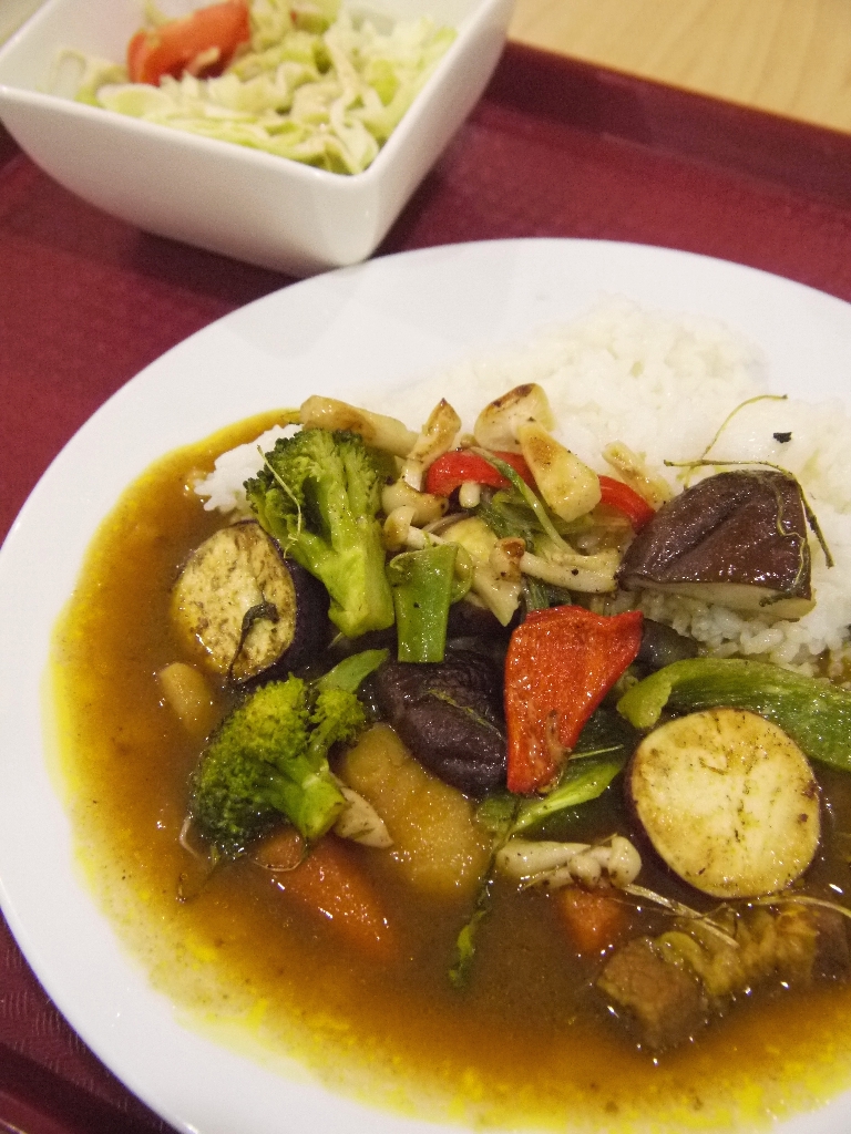 野菜は赤ピーマン、茄子、サツマイモ、ブロッコリー、キノコ、モヤシ等、多彩で、色鮮やか。これで本当に一日分の野菜に相当するのかどうかは不明だが(よく言われる1日250gには及ばない気がする)、色々な野菜が一皿で食べられるのは有り難い。