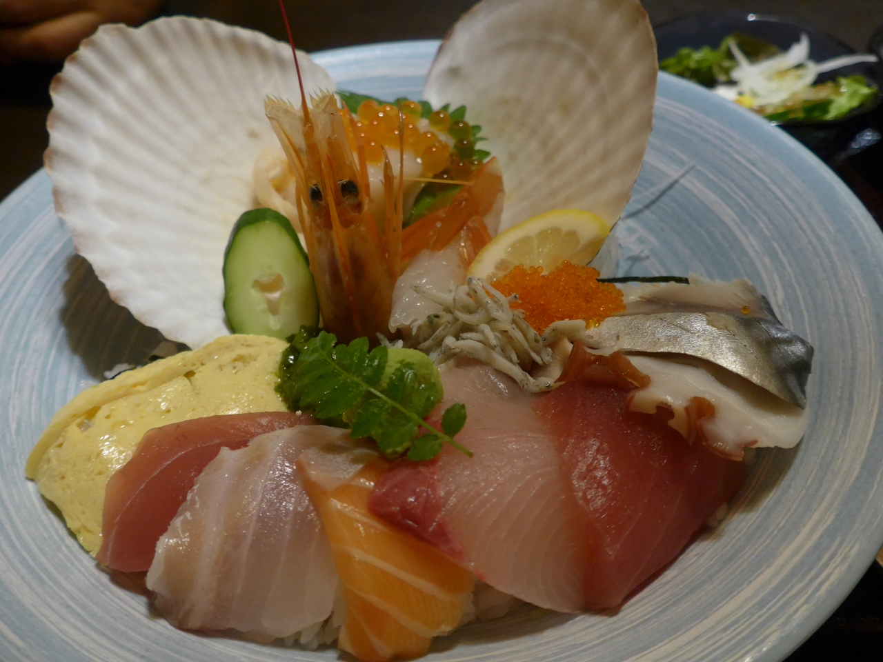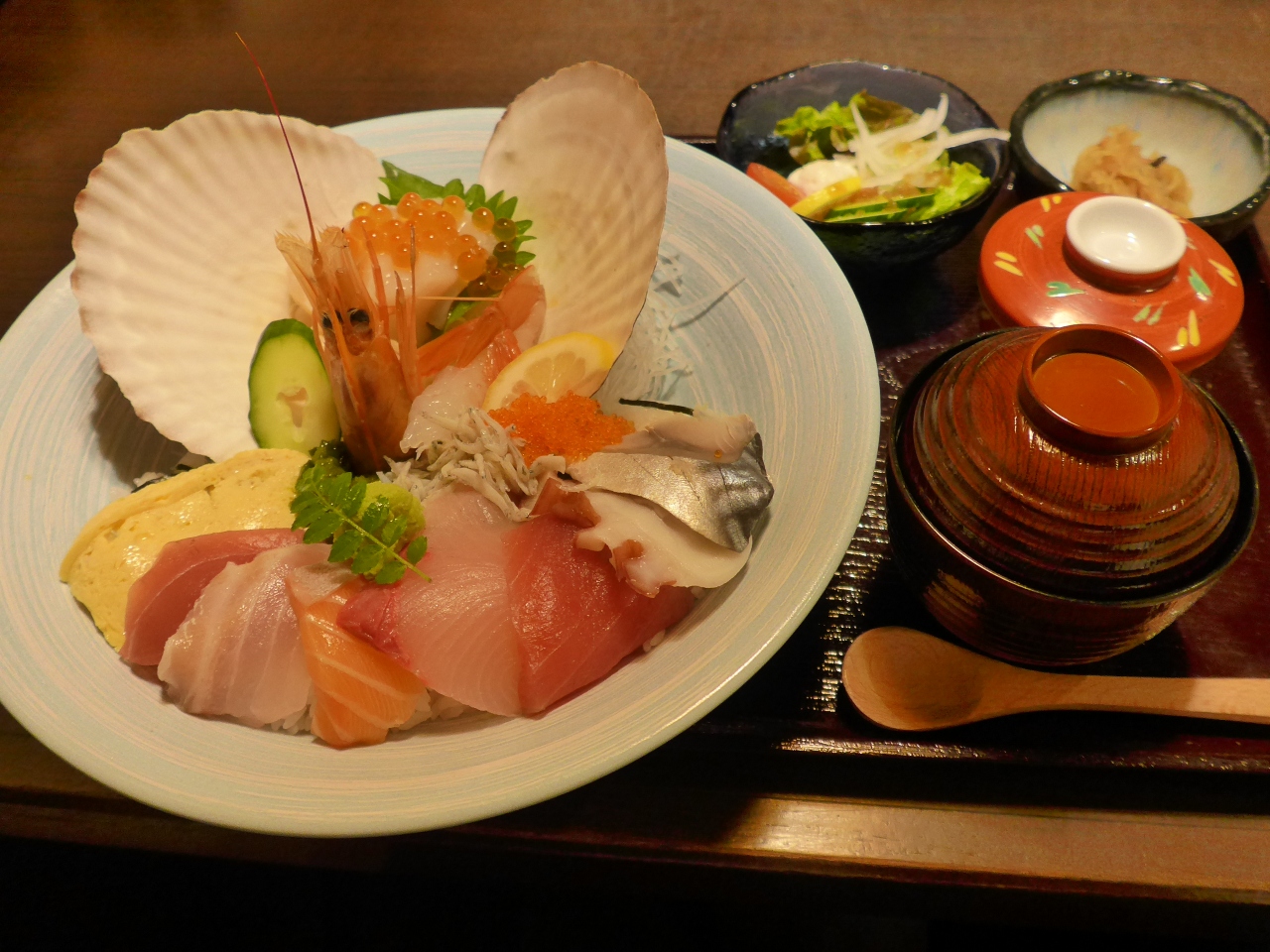 出てくるまで20分位要しましたが出て着てびっくりとても大きな器にたっぷりの海の幸が乗った大きなどんぶりが出てきました。そして茶碗蒸し・お味噌汁・ミニサラダ・大根の味付け、別にお漬物と多さにもびっくり出した。