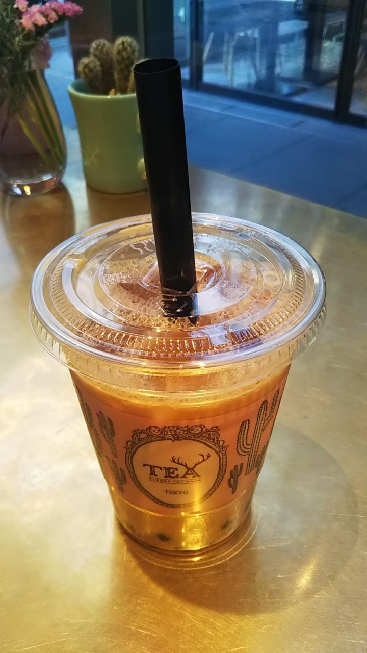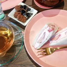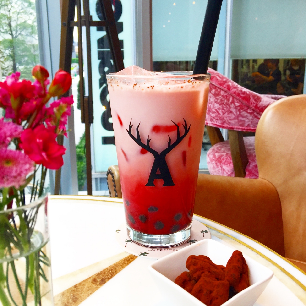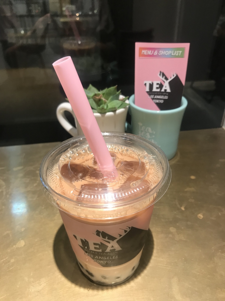 ロサンゼルス発、テーマカラーはピンク色のティールームです。1階は流行のタピオカミルクティーなどのテイクアウト専用カウンタ... 続きを読むー、2階がティールームになっていて、正統派のお茶は2階でしか注文できません。お店オリジナルのフレーバーティメニューからハワイアンベリーとマスカットティーを注文しました。ハワイアンベリーは、苺とマンゴー、ライチをミックスしたフレーバーで、ティーポットもアメリカンサイズなのか、飲んでも飲んでもなくならないほどのたっぷりとした量で提供されました。ドリンクには、ピーカンナッツチョコと枝付きのカリフォルニアレーズンが付いてきます。