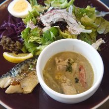 他に、デリ2種類が提供される(こちらは選べない)。今回、デリはひじきと豚しゃぶのエスニックサラダと、鶏モモとそら豆のココナッツグリーンカレーだった。