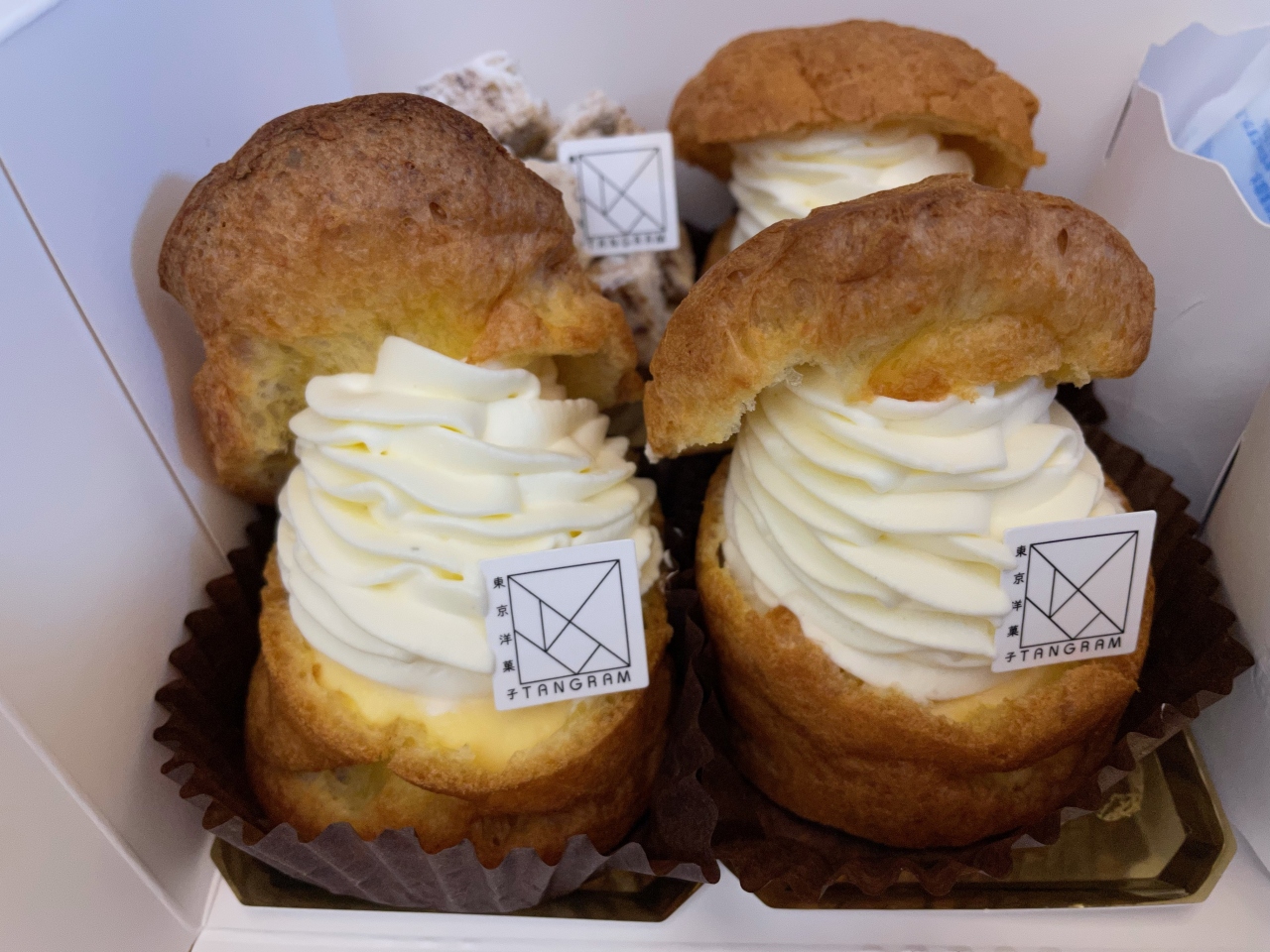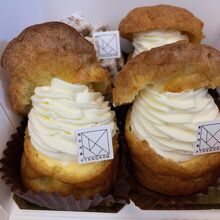 シュークリームは生クリームがたっぷりで、見た目には分かりませんが、下のシュー生地はくぼんでおり、そこにはカスタードクリームが詰まっているので、2種類のクリームが楽しめます。