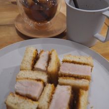 厚さ1センチくらいの分厚い三元豚のロースカツをカットしてトーストした食パンに挟み、それをカットしたものが、皿に盛られている。