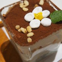 透明の枡の様な容器に、マスカルポーネチーズ、生クリーム、マシュマロ、ココアパウダーを盛って、ティラミスっぽく仕上げている。更にココアパウダーの上にライスクリスピー等を花の形にあしらっていて、上だけを見ると、鉢植えに見える。