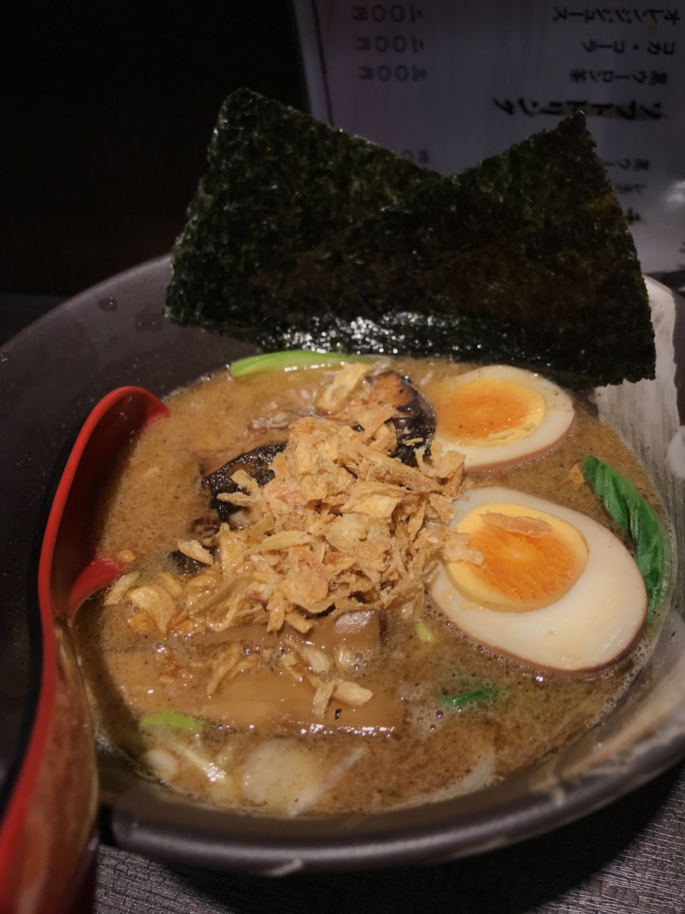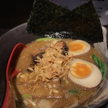器も洒落ていて、直径小さめの深い丼。これは量が少ない系のラーメンか!?、大盛りにしておくべきだったか!?と自問自答しつつ、ラーメンを味わう。トッピングは、チャーシュー、ゆで卵、乾燥玉ねぎ、メンマ、ちんげん菜。海苔。チャーシューはガスバーナーで炙ってくれるので脂がトロトロてす。程よい太さの縮れ麺に濃厚な豚骨魚介スープが良く絡みます。終盤には千切りの柚子の皮が入っていて一気に爽やかフレーバーに。何だかんだお腹いっぱいになりました。