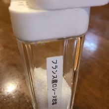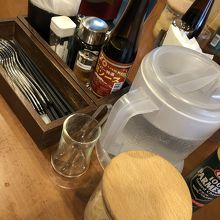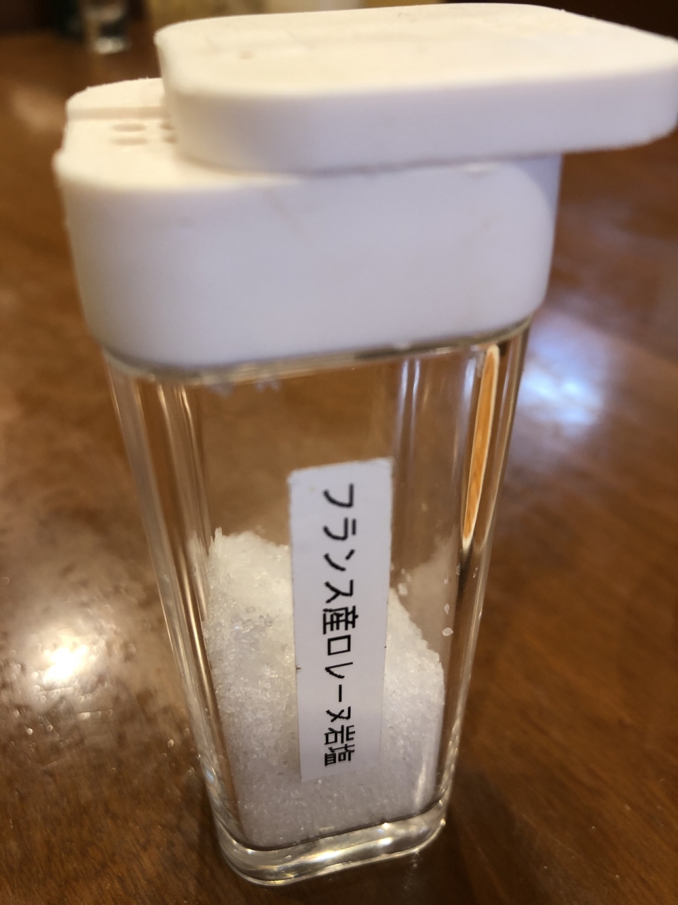 テーブルには、岩塩、ソース2種類、唐辛子、ガリ、粉チーズが置かれている