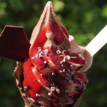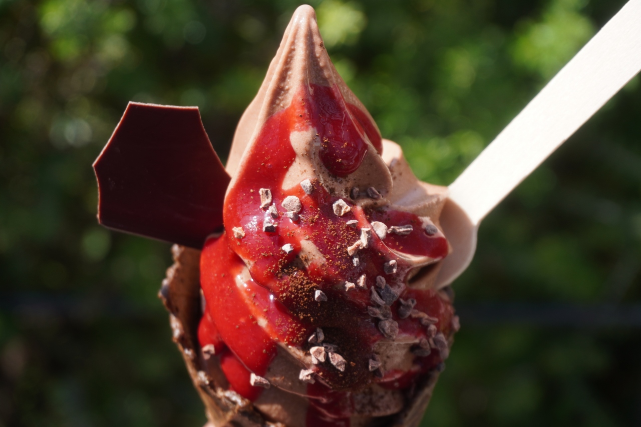 店内はレトロなアンティークが飾られたりしてちょっと拘りの雰囲気もあるし、さすがですね。いただいたのは、チョコのソフトクリーム。カカオ70%という濃さギリギリのチョコレートに赤いドロッとしたソースはフランソワーズ。苦みと酸味はそれぞれ妙な手を加えていなくて、全体としてまさに直球勝負のガツンとした仕上がり。誤解を恐れないでいうと、素直なおいしさということではないですが、たまにはこういうのを味わってみるのも面白いかな。気持ちの良い屋外のテーブル席もしゃれていると思います。 閉じる投稿日:2022/04/06