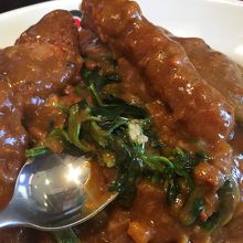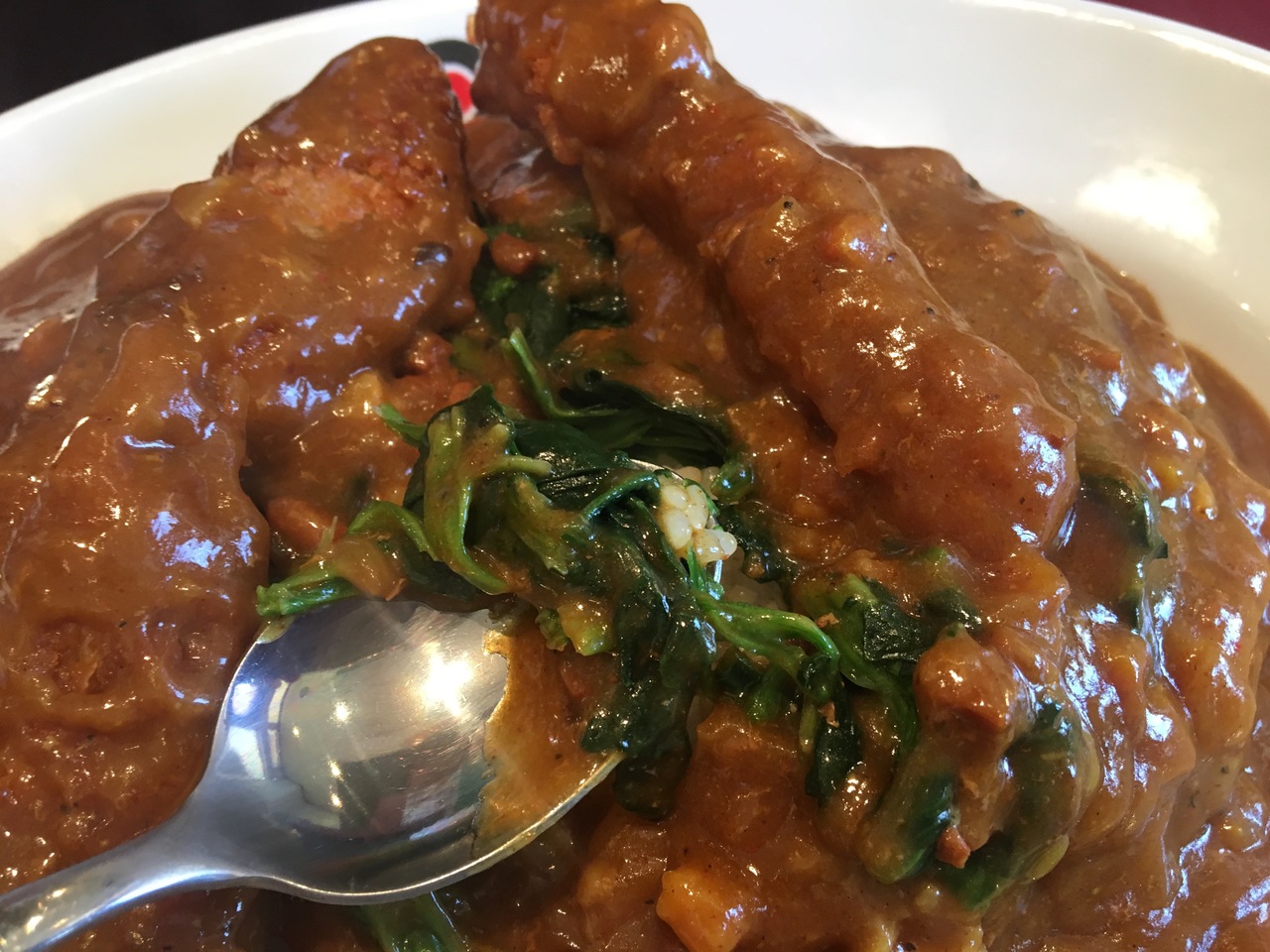 ルーの下にはほうれん草たっぷり。これは他店にはなかなかないトッピングでいい感じ。フィッシュと海老フライもそれなりのサイズのものが乗る。やはりコスパは悪くない。